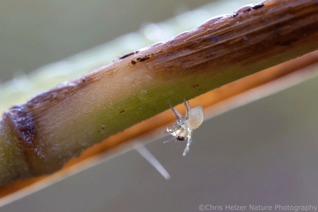 When I got home, I looked at the image more closely and it didn’t look quite right for a spittle bug larva. I drove back over to Lincoln Creek and took some more photos, using a higher magnification. Then, I extracted the object to see what it was. In the photo below, you can see some legs. That’s because the object turned out to be a tiny spiderling. I’m pretty sure it was a lynx spider baby, a topic that I’ll return to later in this post.