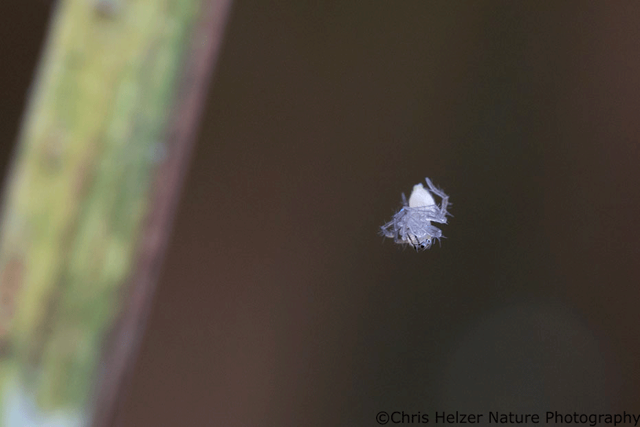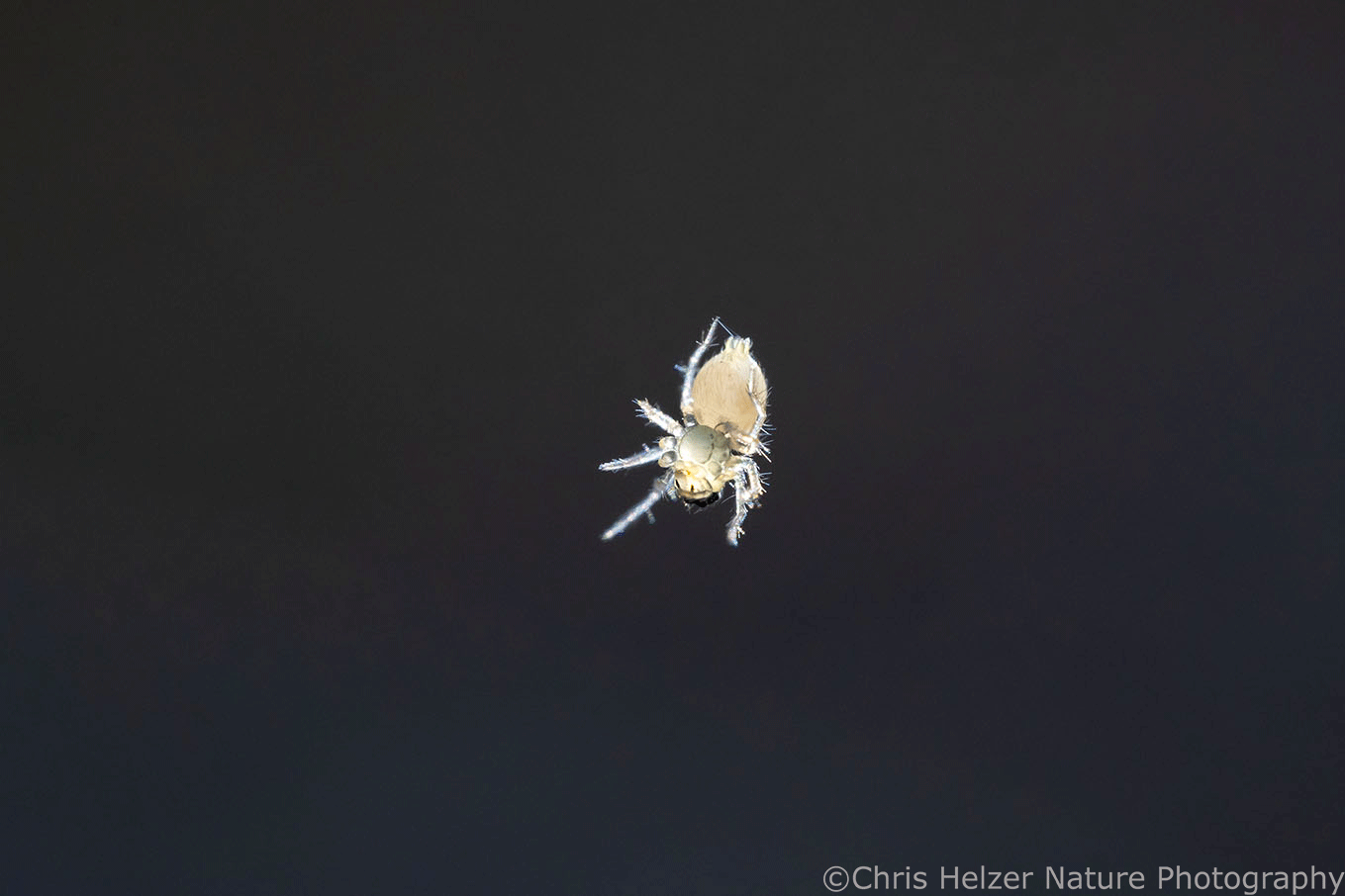 Obviously, I don’t know for sure that the little spiderlings I saw within a few feet of the egg sac had hatched from that particular sac. It seems likely, though, doesn’t it? Here are a few photos of tiny spiderlings from that week. For context, these spiderlings were about 3 millimeters in length.