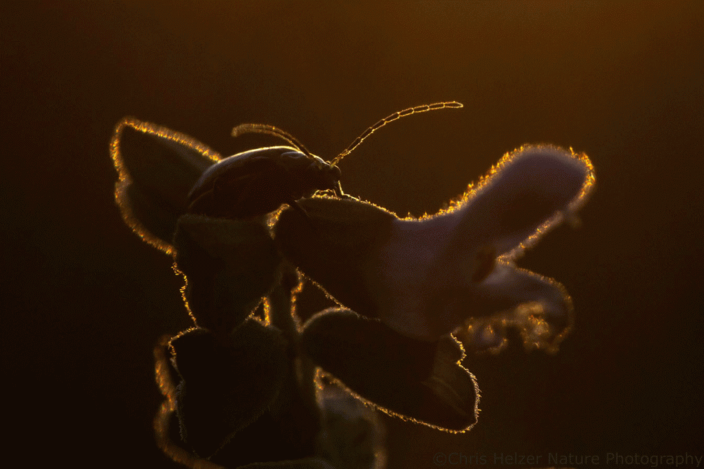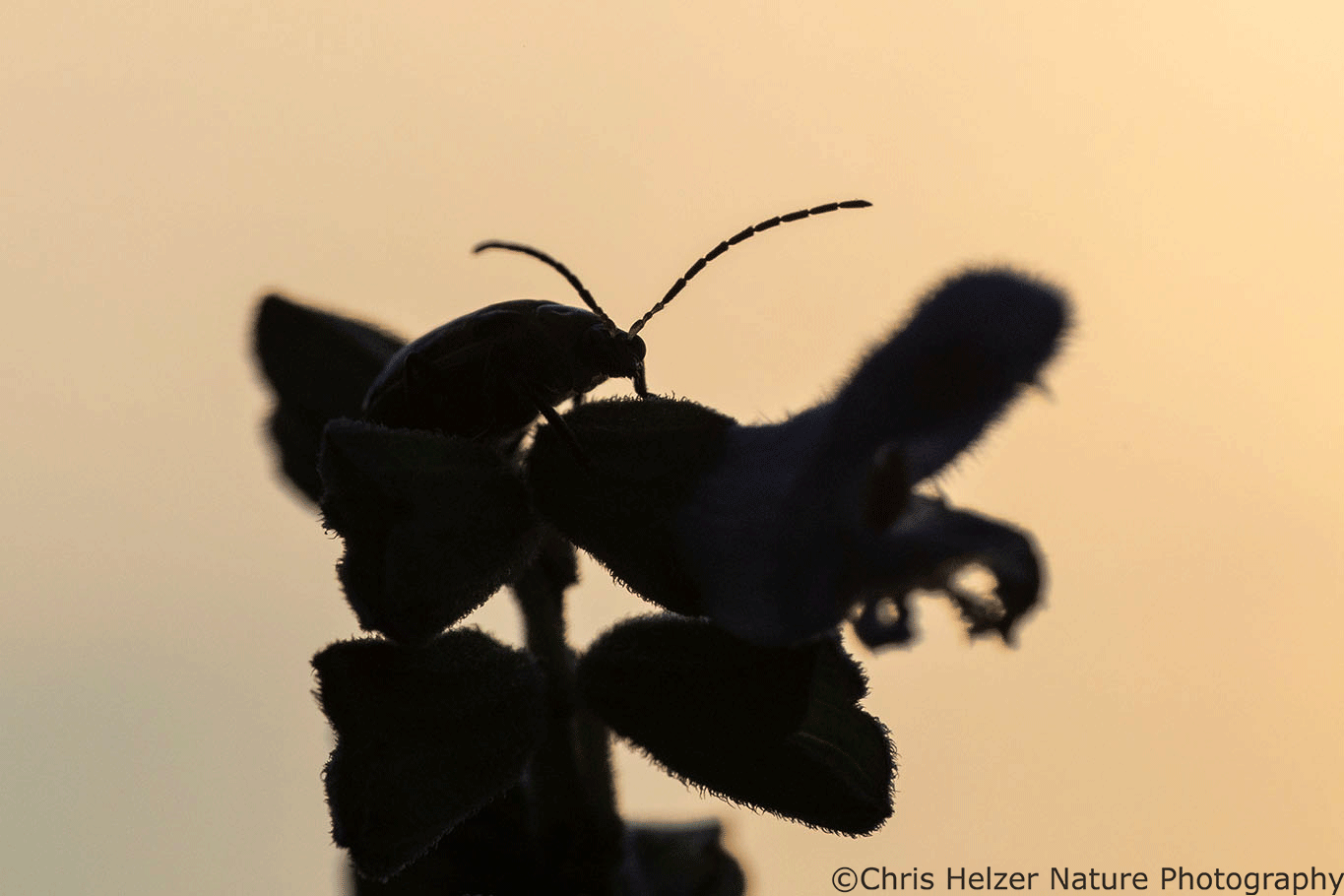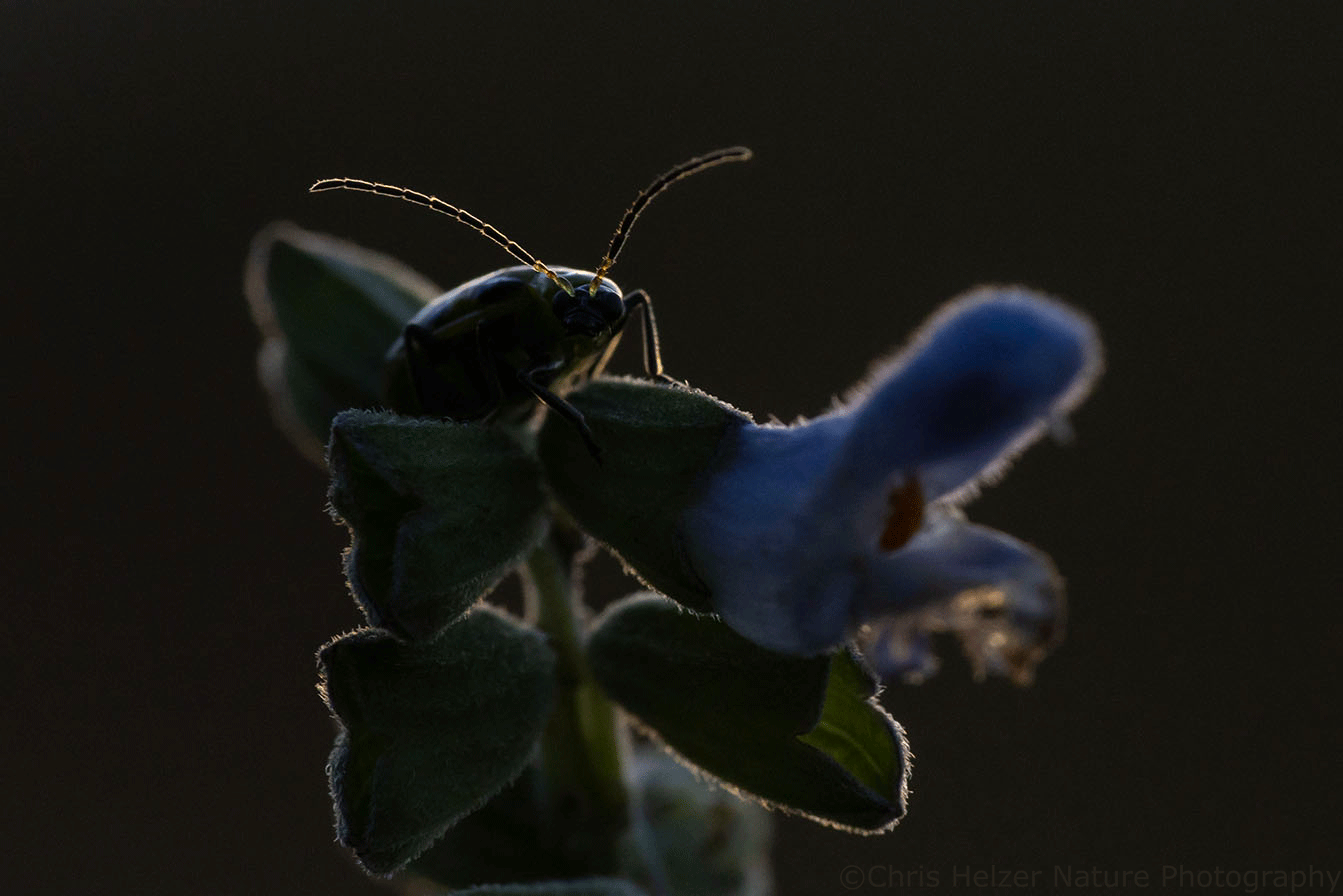 A few days before I took the above photo, I found the same, or a similar, cucumber beetle on a pitcher sage plant before sunrise. I photographed it in silhouette and then stuck with it over the next few minutes as the sun breached the horizon. The three photos below show the results of the changing light during that short period (and some changes to the angle I shot the beetle from).