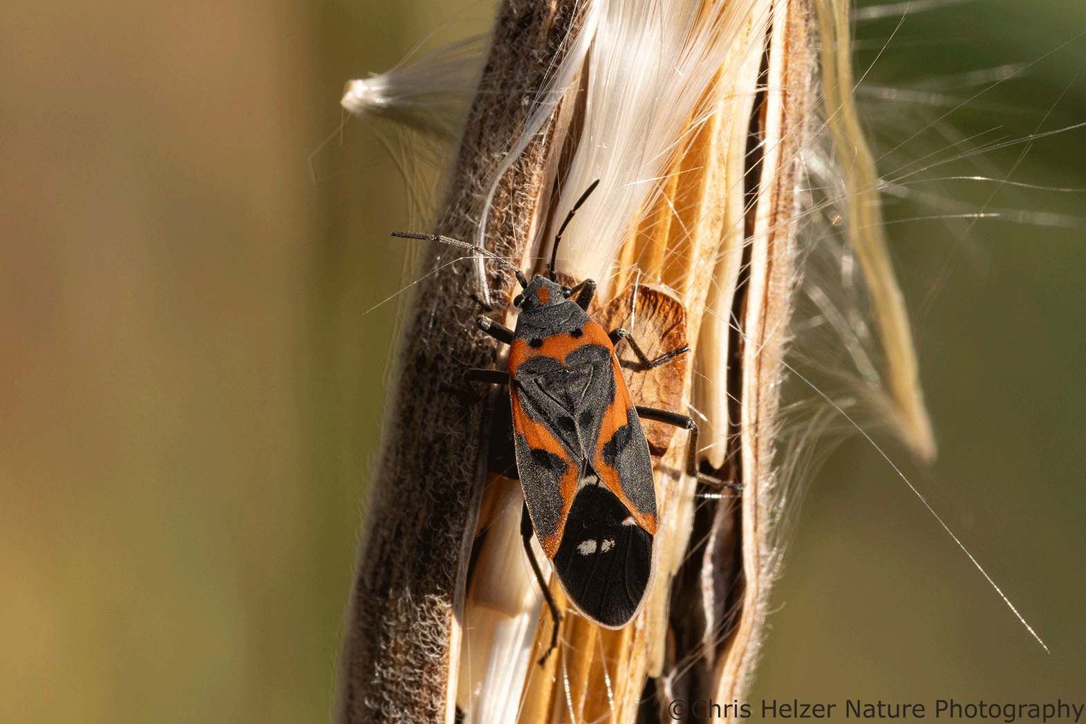 Small milkweed bugs (Lygaeus kalmii) have been hanging around for about a month or so. As I understand it, they (and their offspring) feed primarily on the seeds of milkweed plants, using their long mouthpart. In fact, they can insert that straw-like mouth appendage through a milkweed pod and into the seeds within. Now that the butterfly milkweed pods in my plot are opening, access is even easier.
