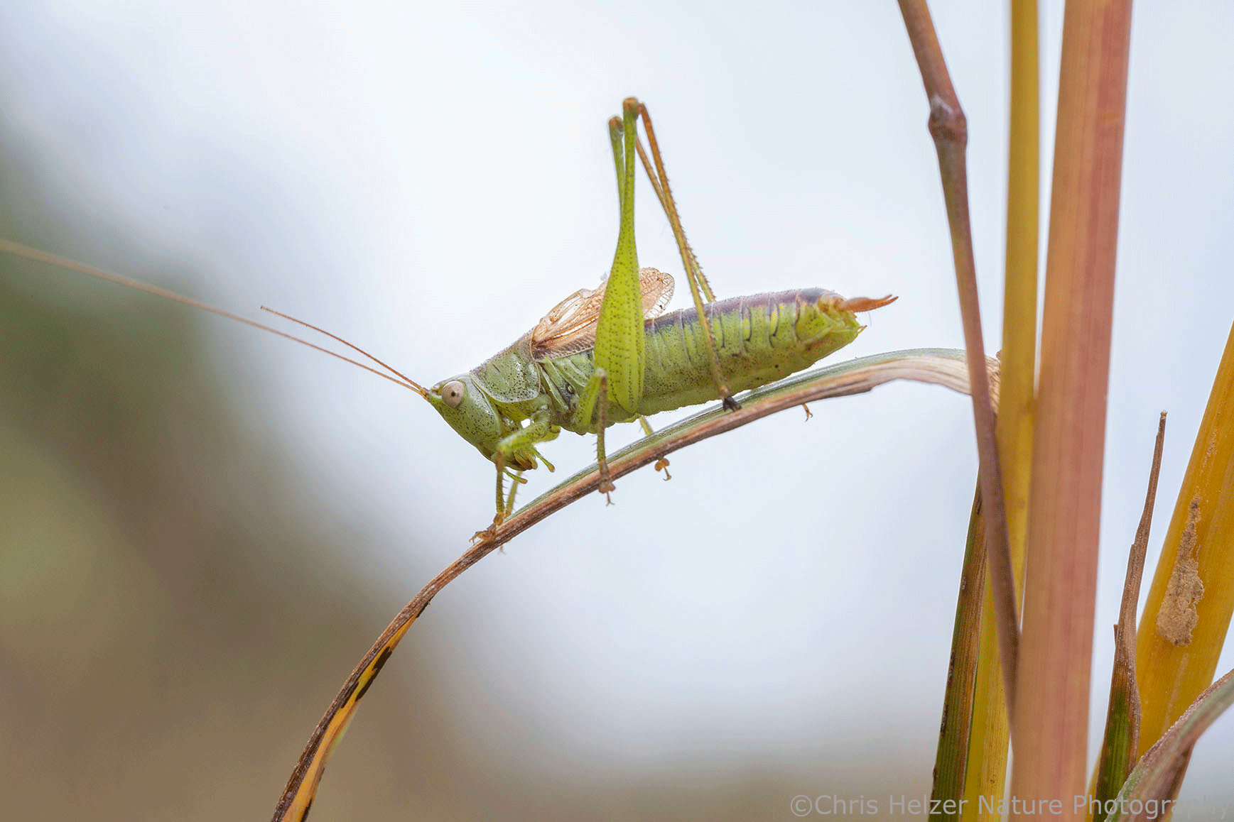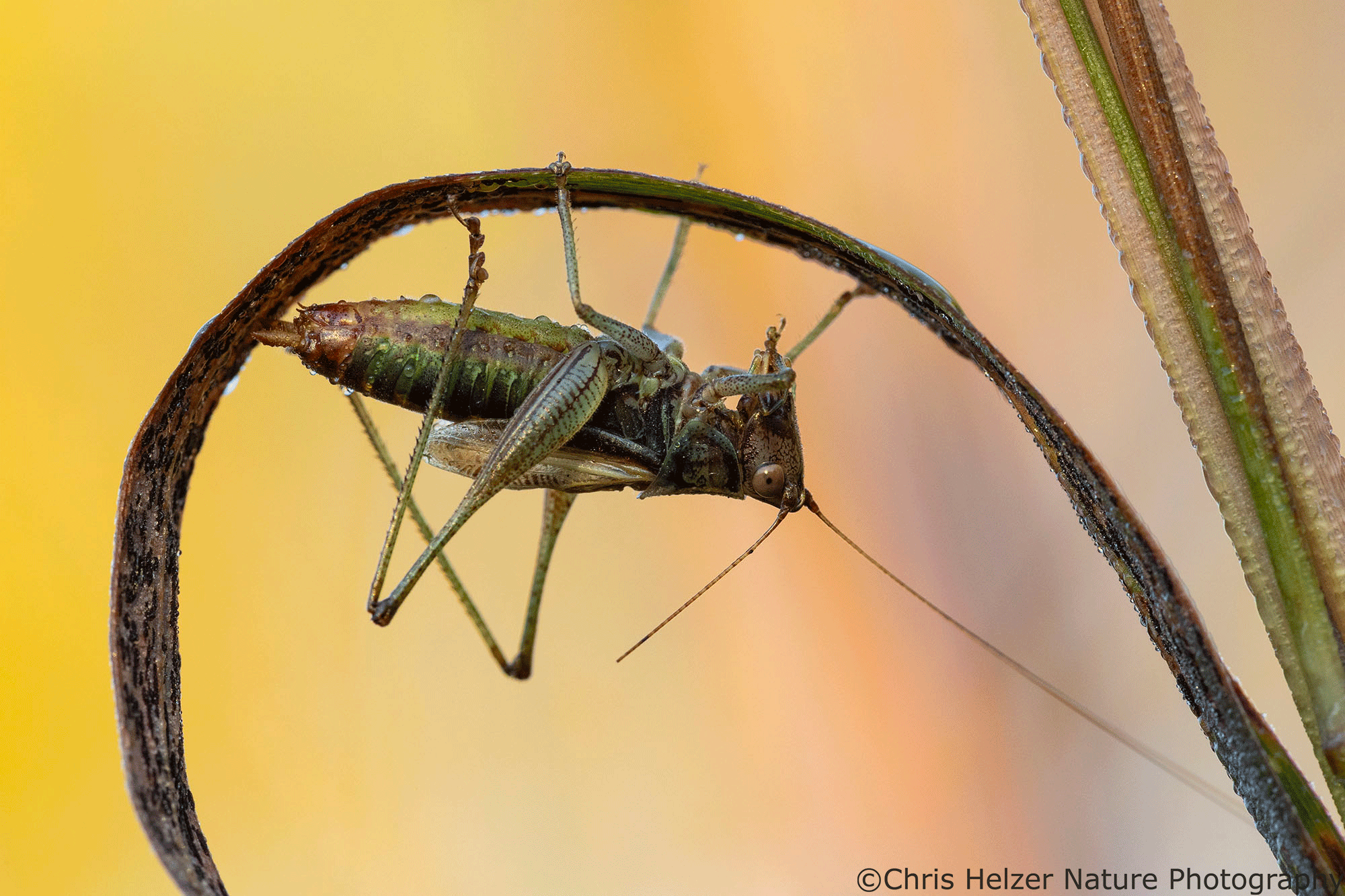 I tried a couple different compositions. Then, I scanned the rest of the plot to see if there was anything else of note. Seeing nothing more interesting than the katydid, I came back and photographed it for a while longer. It started moving around, warming in the sun. I stayed with it and photographed it in different positions.