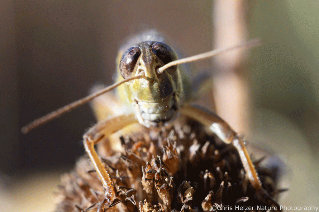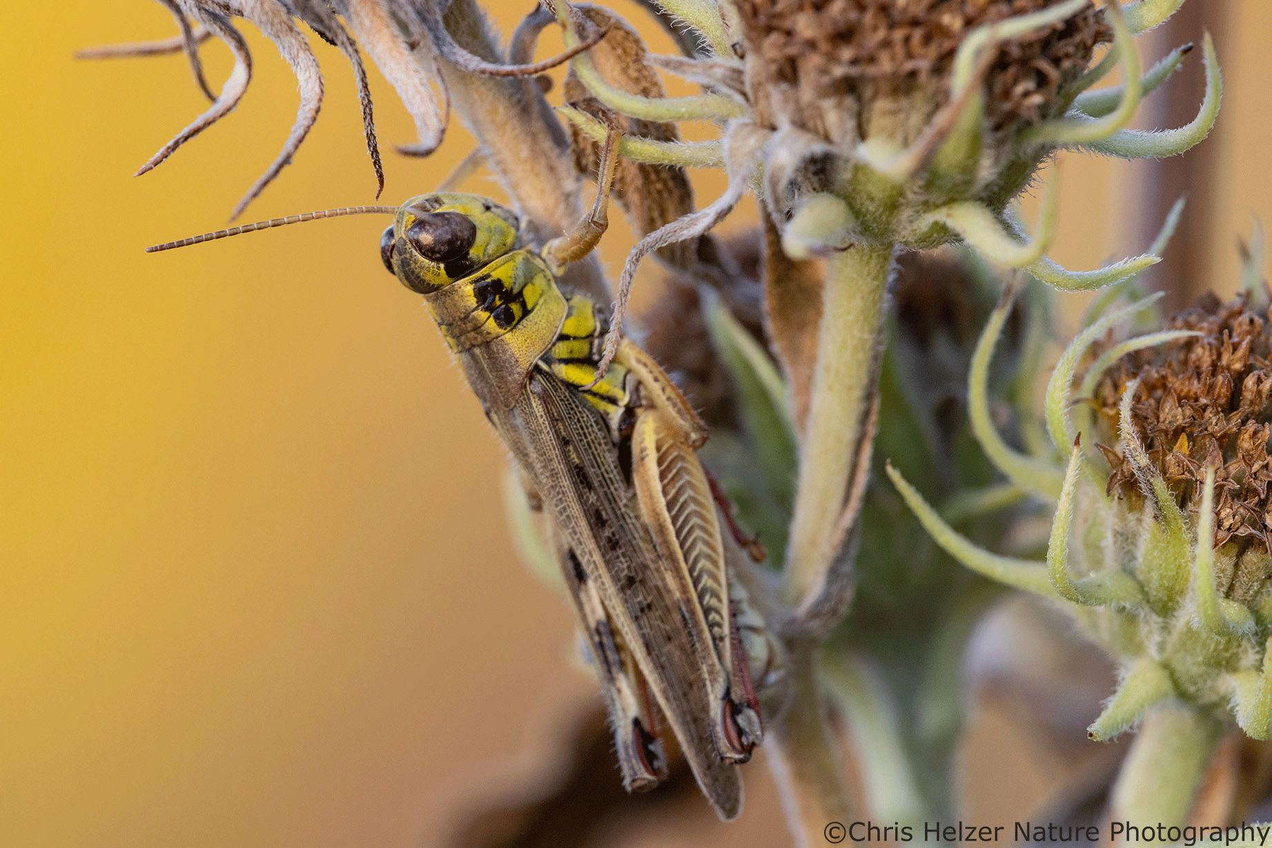 During my first run through this project (2018 – using the same plot), one of the big surprises was the tiny number of grasshoppers I encountered through the year. Six years later, in my second attempt, I’m still not seeing a lot of grasshopper species, but they’ve been a fairly common visitor. This fall, at least one (or several that looked alike) was around pretty much every morning – usually hanging out near the top of a sunflower. I assume it was there to both catch the morning warmth right away and because it was feeding on sunflower seeds.
