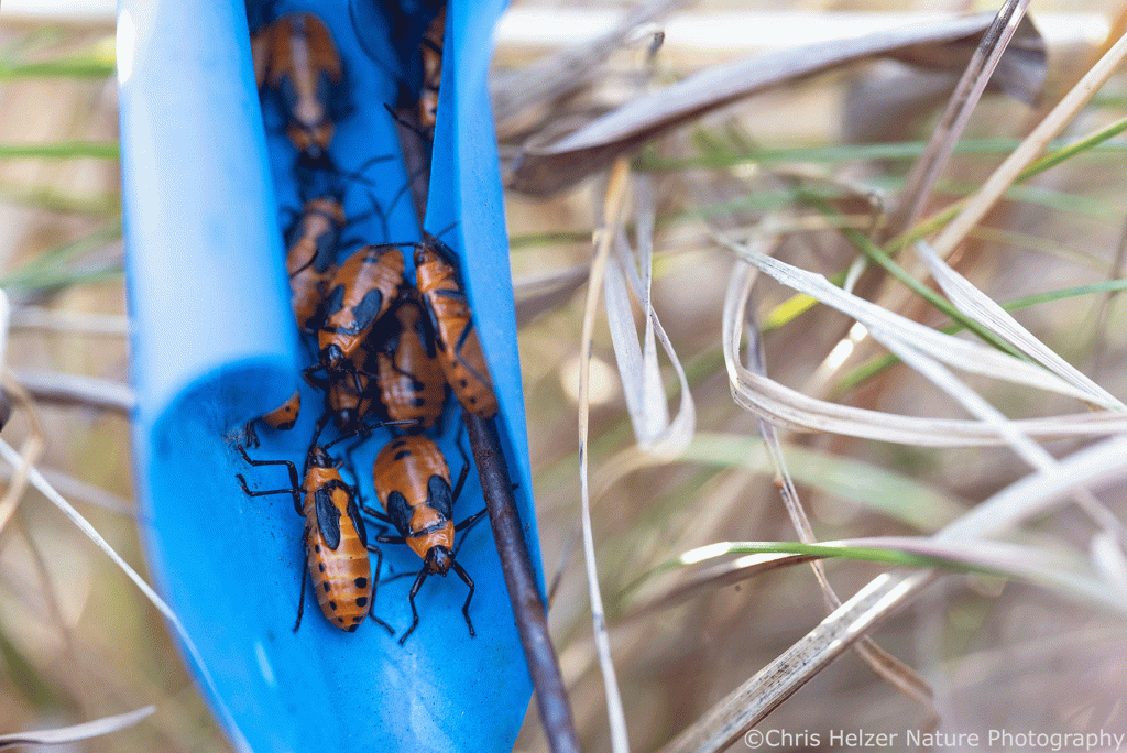 Small milkweed bug nymphs, especially, were still in the plot for a couple weeks after the last seed blew away. As far as I know, those seeds are crucial fuel for the growth and development of those juvenile bugs, so I was surprised the bugs didn’t wander off to other parts of the prairie where there were still seeds available. Don’t get me wrong, I was happy to have them around. I was just confused.