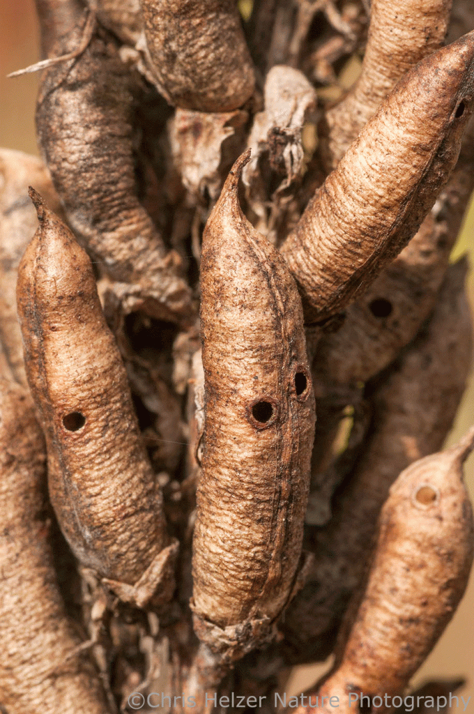 The second example comes from my own experience. Canada milkvetch (Astragalus canadensis) can be frustrating to harvest seeds from because the pods are often empty by the time we get to them. Those empty pods are easily identified because of the exit holes left by larvae of a small weevil (Tychius liljebladi) that feed on the seeds and then burrow out of the pod when they’re done. After leaving, the larvae dig into the soil beneath the plant, where they overwinter. The next summer, they emerge as adults and will lay eggs on the flowers in mid-summer to continue their life cycle.