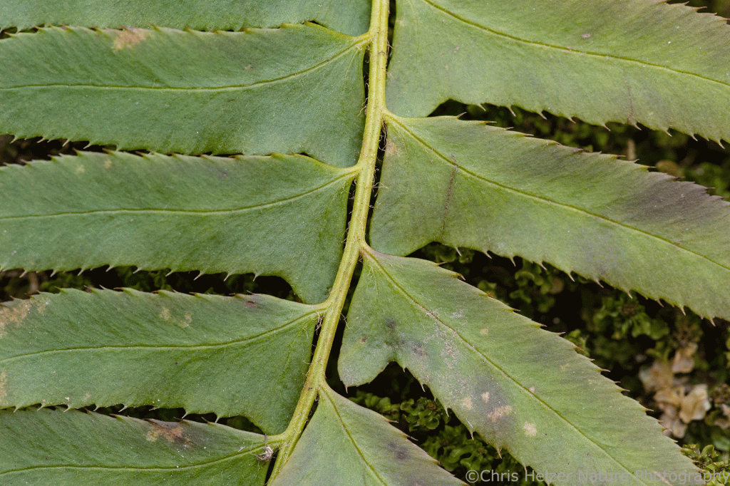 Christmas fern (Polystichum acrostichoides), I think. Supposedly this species keeps its fronds vertical until after the leaves fall and then lays them down on top of the leaves to catch more sunlight through the winter. Pretty cool strategy.