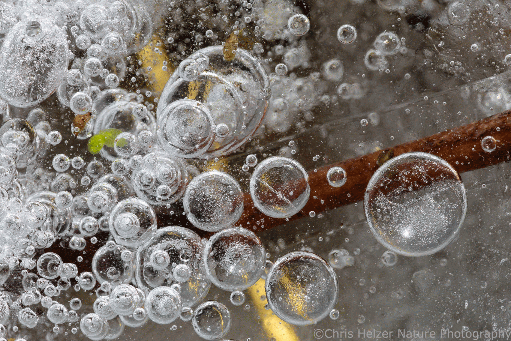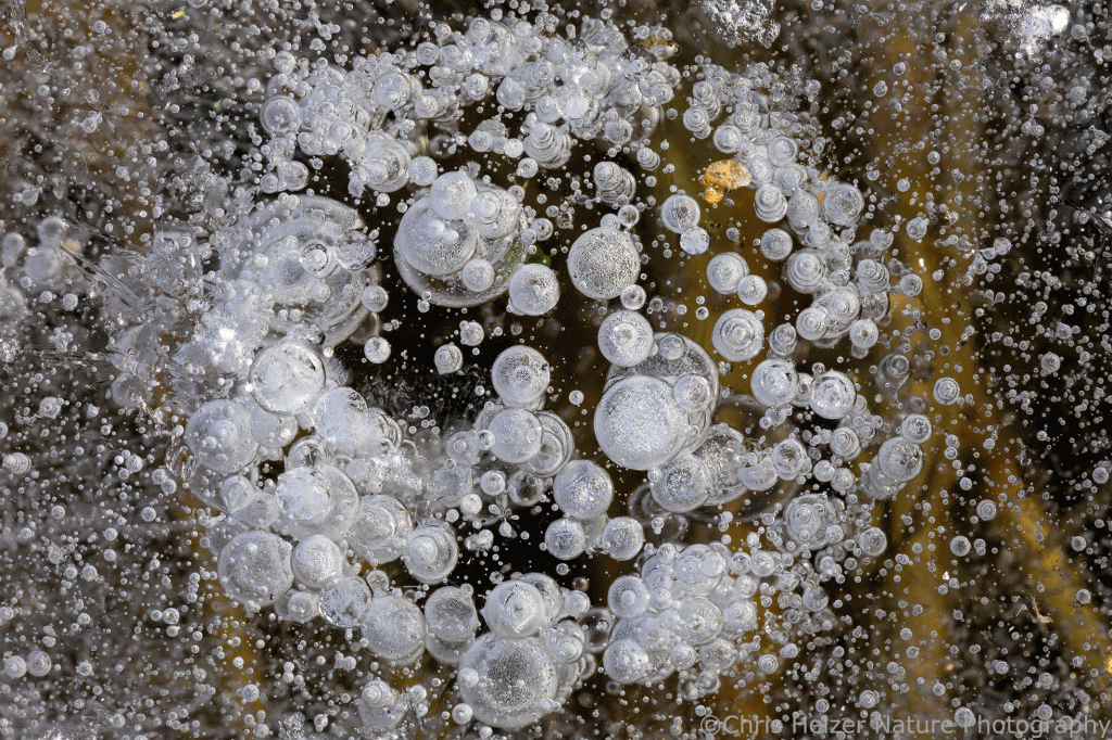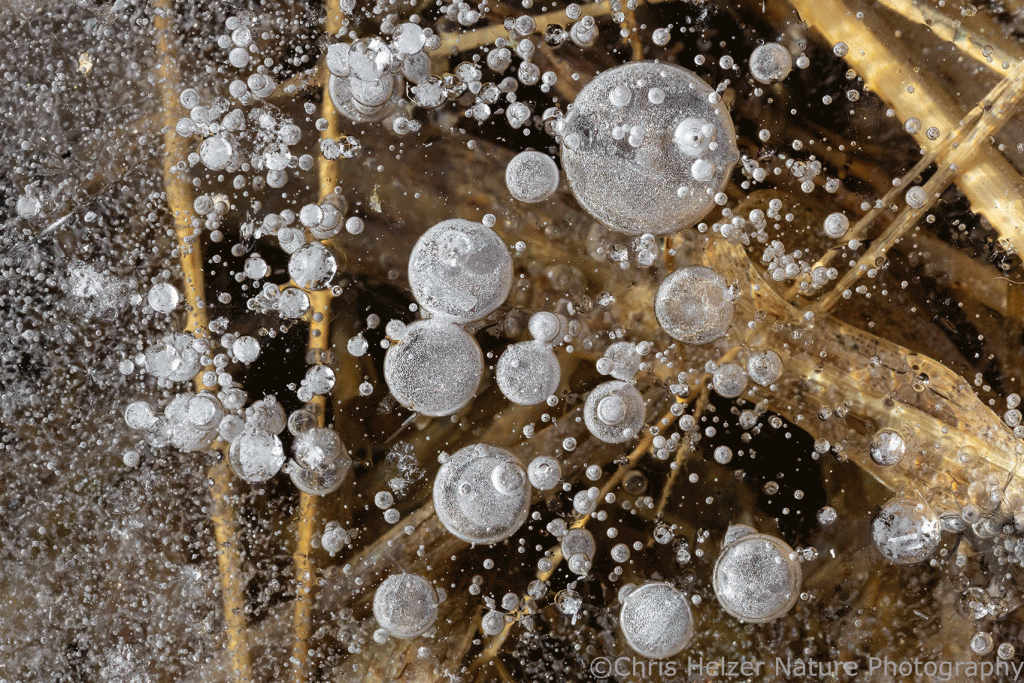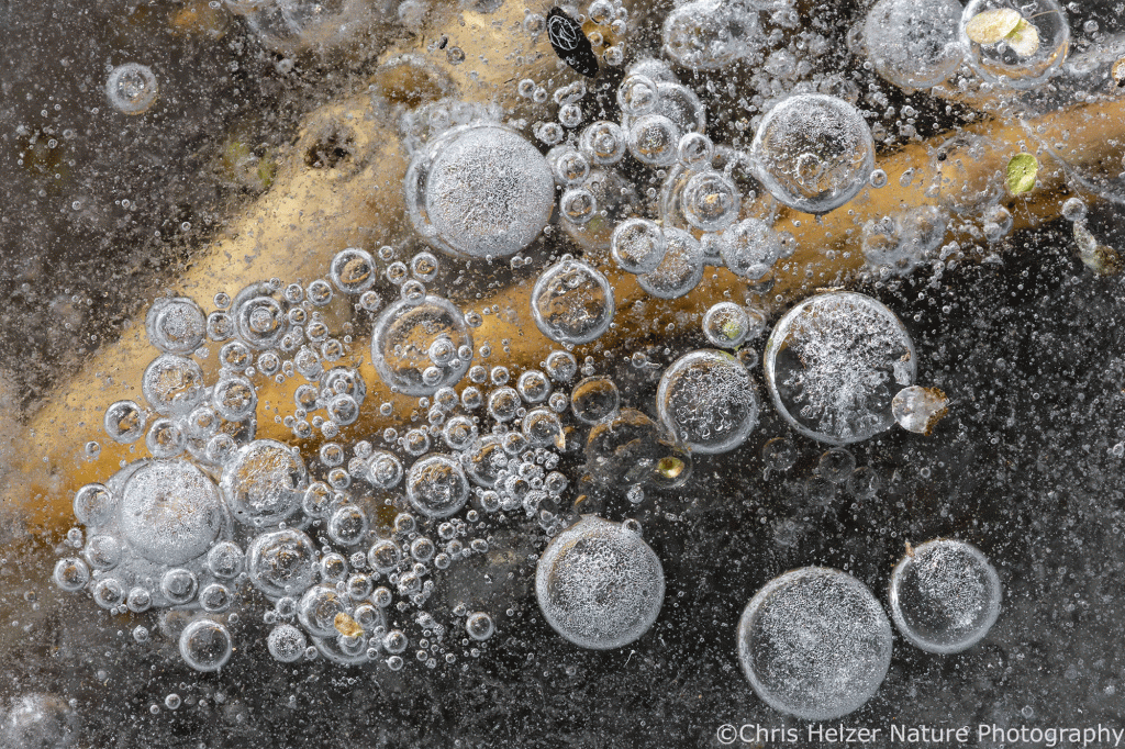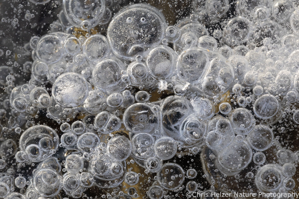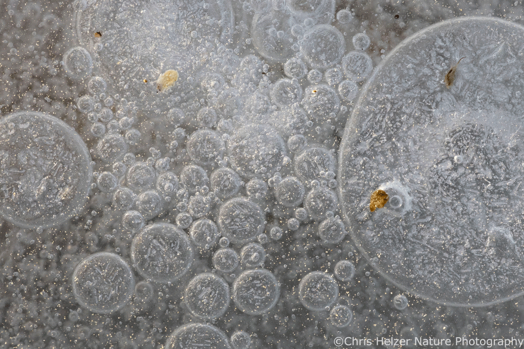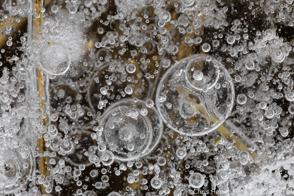 The highlight of my two trips, of course, were the ice bubbles. Most of the ice looked like frosted glass and wasn’t transparent enough to show the ice bubbles that were surely trapped within it. Around the base of some plants, though, it looked like the ice had melted and refrozen, and that’s where the bubbles were. The rest of the photos here are just a few examples of the many, many bubbles I enjoyed photographing. I find them mesmerizing to stare at – like little galaxies of bubbles.