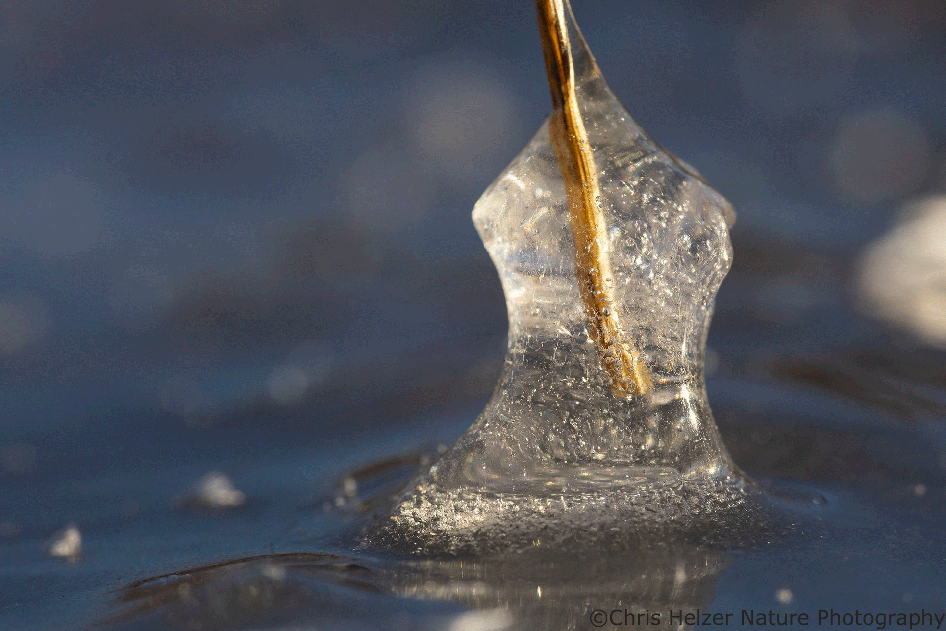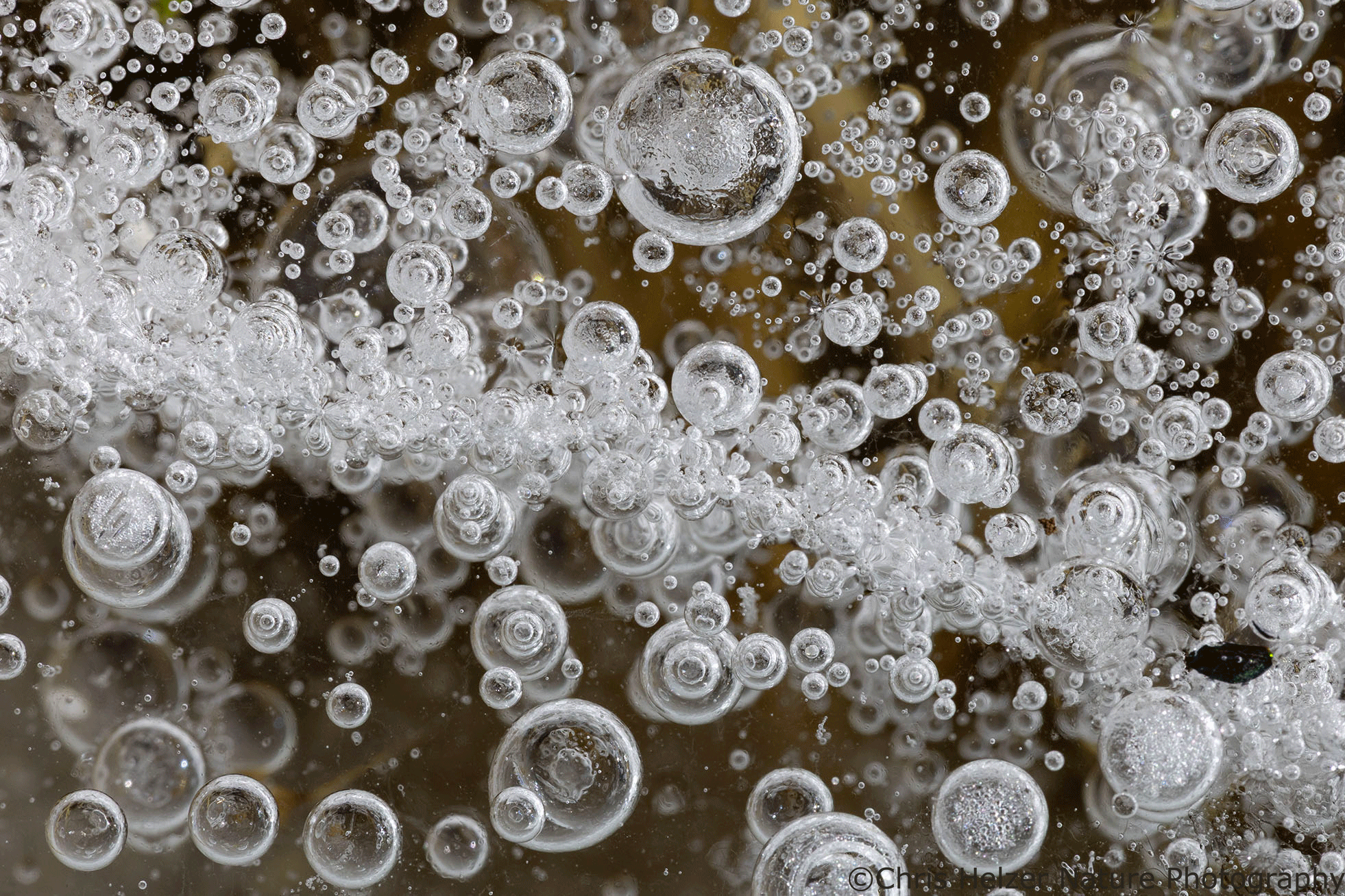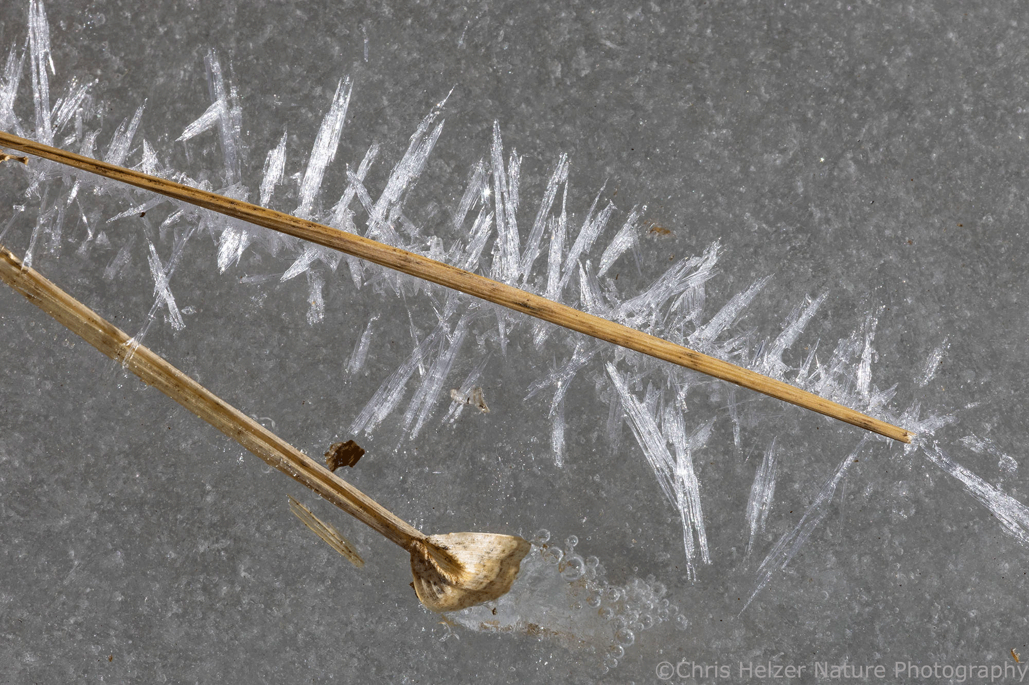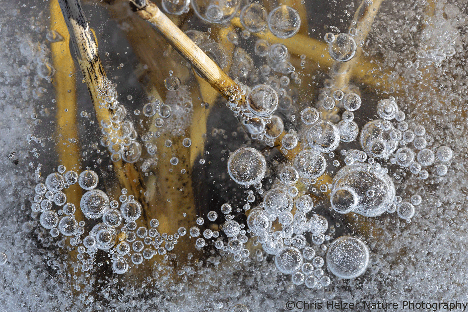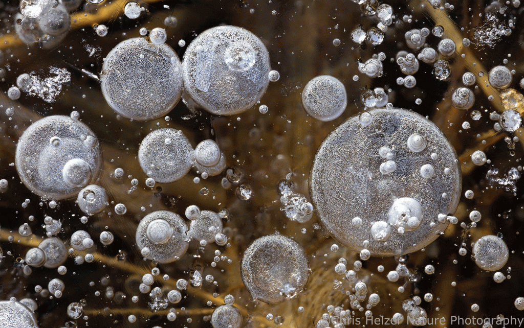 The highlight of my two trips, of course, were the ice bubbles. Most of the ice looked like frosted glass and wasn’t transparent enough to show the ice bubbles that were surely trapped within it. Around the base of some plants, though, it looked like the ice had melted and refrozen, and that’s where the bubbles were. The rest of the photos here are just a few examples of the many, many bubbles I enjoyed photographing. I find them mesmerizing to stare at – like little galaxies of bubbles.