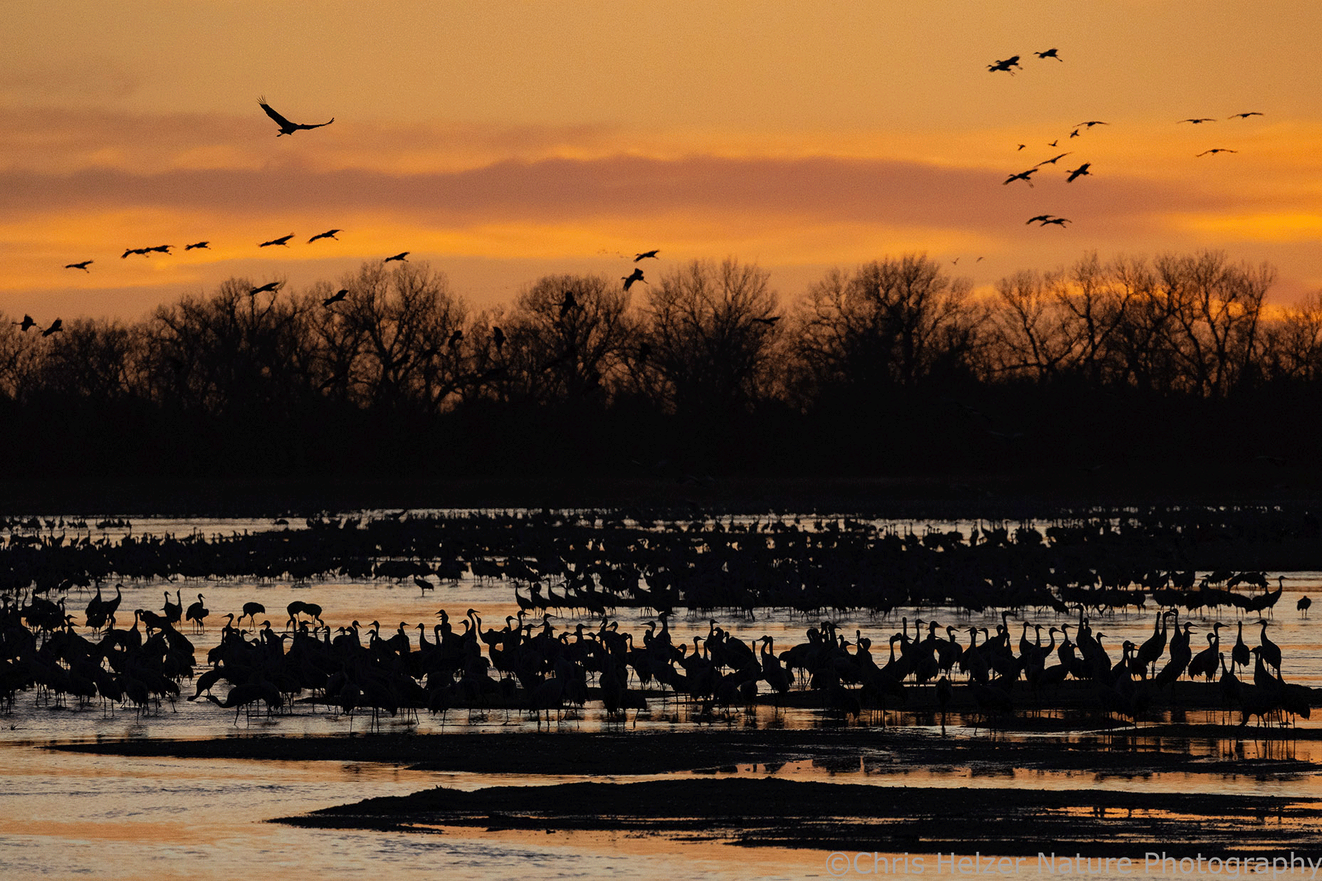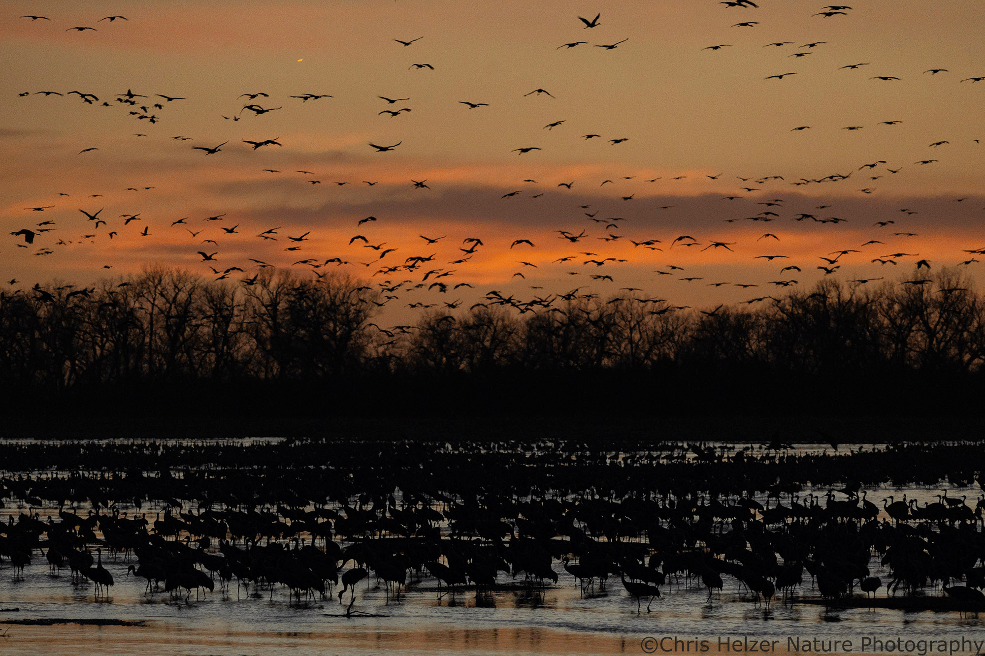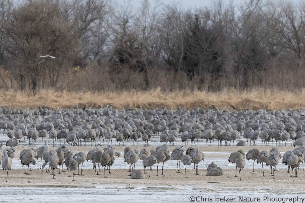 Because the birds decide when and where to roost for the night based on a lot of different factors, we never know for sure what kind of show we’ll get to see from the viewing blind. About a week ago, we watched them crowd against the north bank to escape blisteringly-cold blasts of wind. One a particularly cold morning, some cranes were lying on their bellies to reduce how much of their body was exposed to the cold.