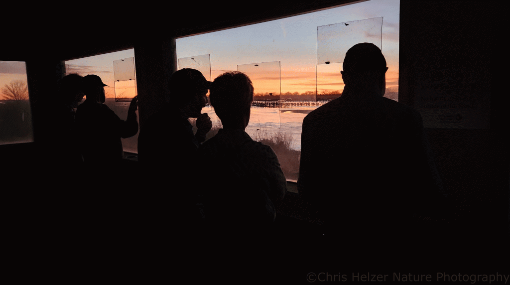 Sometimes, we see cranes arrive at the roost well before sunset, but often they start arriving as the sun goes down and the majority pour in just before it’s too dark to see them. And, sometimes, they decide to roost in a part of the river that doesn’t include our viewing blinds.