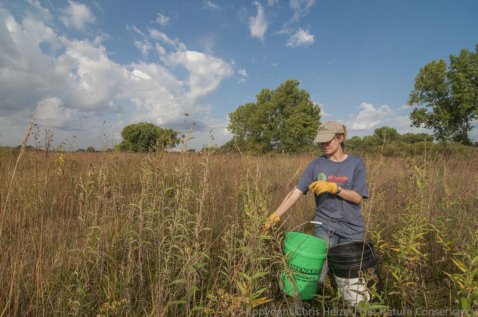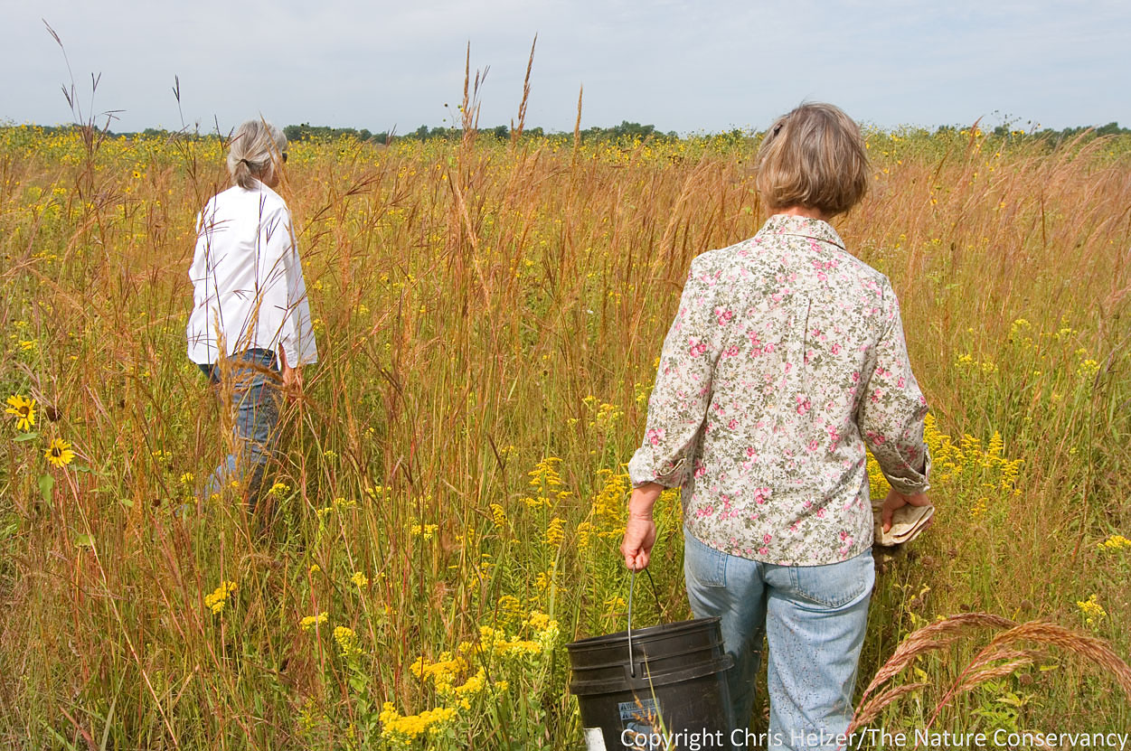 1. Harvest seeds.  This is done mostly by hand, with mechanical seed strippers or combines being used for harvesting major grasses and some other species.  Hand harvesting by just a few people can provide enough seed to plant a couple hundred acres a year.  We try to harvest from as many species as possible, targeting 230 species when a restored site will have habitats spanning from wet to dry.