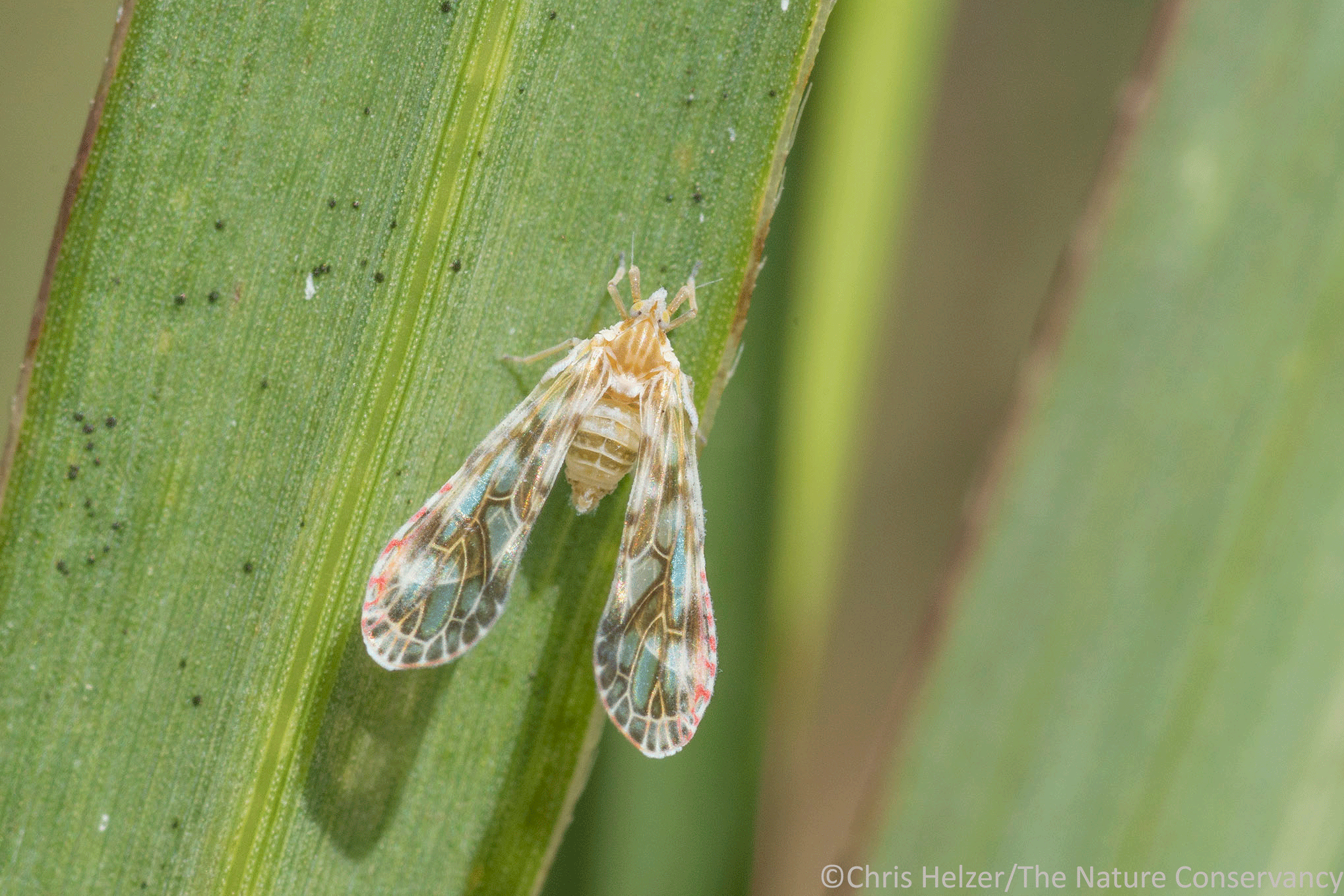 Derbid planthoppers are a very diverse group of insects with almost 1,700 species found around the world. According to a couple online sources, derbid nymphs feed on fungi. Adults feed on plants, and at least some are host-specific, meaning that they feed only on a single plant species or group of species. I would love to know if the derbid I photographed was a specialist feeder on one of the plants in my little plot. I would also love to know if the derbids I found in the plot in September and October were actually the same individual as the one from August. It seems unlikely – but probably more likely than a zombie fly.