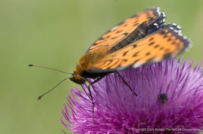 ENPO110624_D013 Published June 26, 2011 at 800 × 529 in ENPO110624_D013 A regal fritillary flattens itself against a wind gust while nectaring on musk thistle. Dahms 2000 Prairie Restoration – Platte River Prairies, Nebraska. Regal fritillary butterfly (rare species) nectaring on musk thistle (noxious weed). Flattening wings against a stiff wind.