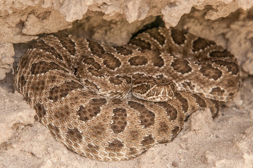 enpo160822_d049 Published March 21, 2019 at 1286 × 854 in enpo160822_d049 Prairie rattlesnake in the shade of a rock ledge. Blue Creek Ranch, Garden County, Nebraska. Ted Turner Sandhills Inc.