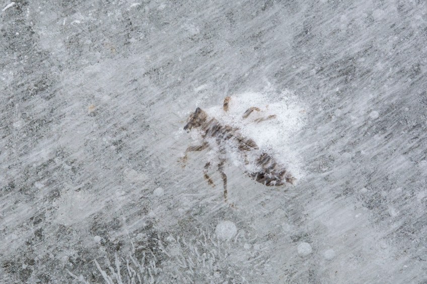 ENPO180205_D004 Published December 16, 2018 at 1670 × 1113 in ENPO180205_D004 Snow blowing across dragonfly larva in a frozen wetland at the Helzer Family Prairie.