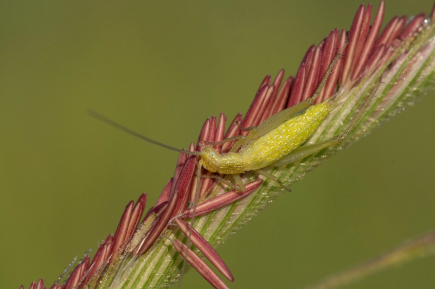 ENPO180802_D014 Published December 27, 2018 at 2000 × 1333 in ENPO180802_D014 Tree cricket on flowering prairie cordgrass (Spartina pectinata). The Nature Conservancy’s Platte River Prairies. Dahms Pivot wetland restoration.
