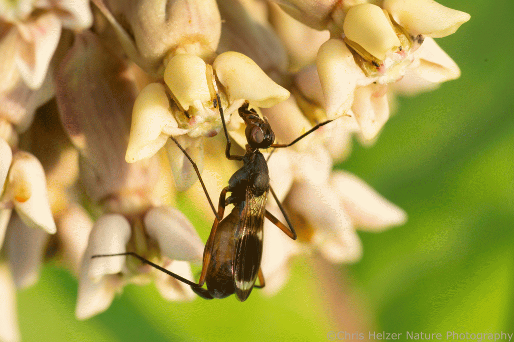 Because milkweed flowers draw lots of insects to feed on them, they also host predators that hunt those hungry visitors. I saw a couple crab spiders, but none that were particularly photogenic. I did manage to photograph one of the many small long-legged flies that were hunting even more tiny invertebrates on milkweed leaves. They looked like tiny emeralds with wings.