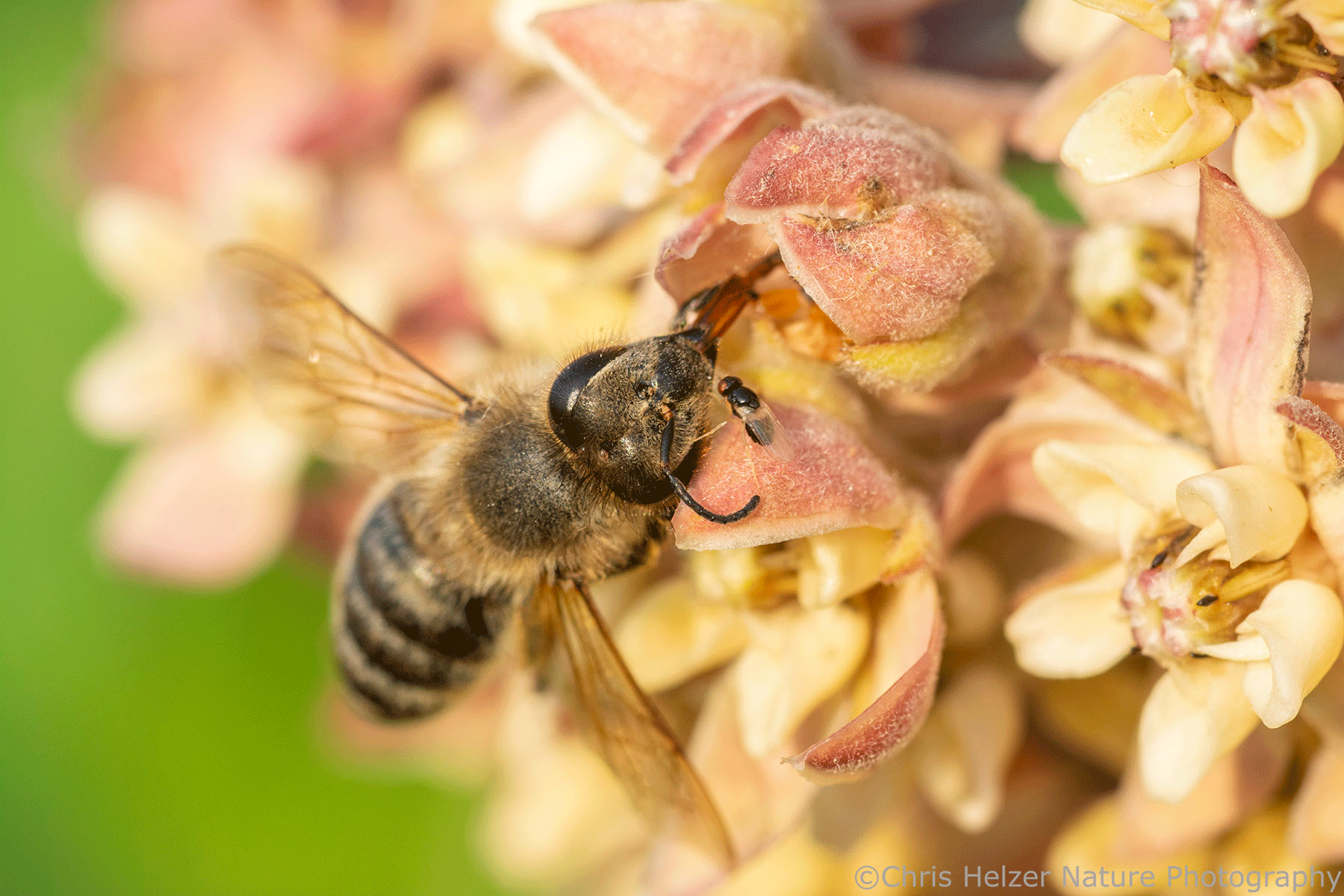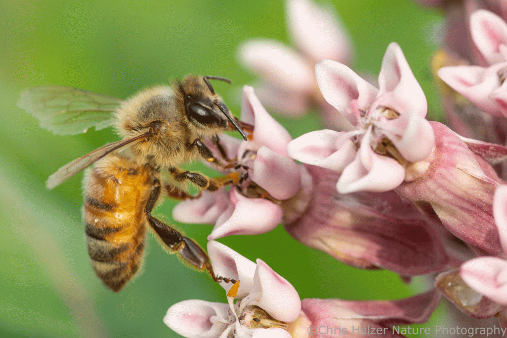 A few honey bees were visiting the flowers, but I didn’t see many native bee species. Honey bees probably do a pretty good job of milkweed pollination because their legs are big enough to pick up and deposit pollen. However, they sometimes have trouble extracting their legs from the flower slits. I found one individual that appeared to have died after getting stuck in that exact way. I’m no fan of honey bees but I didn’t celebrate its death. It was an unfortunate and accidental victim of milkweed’s weird sex game.