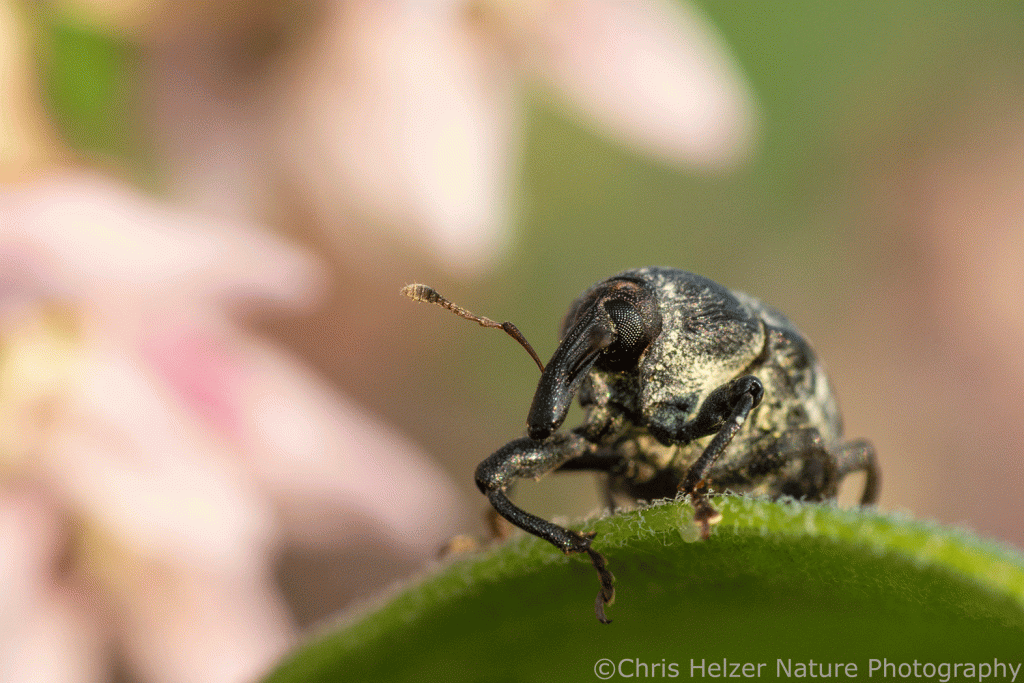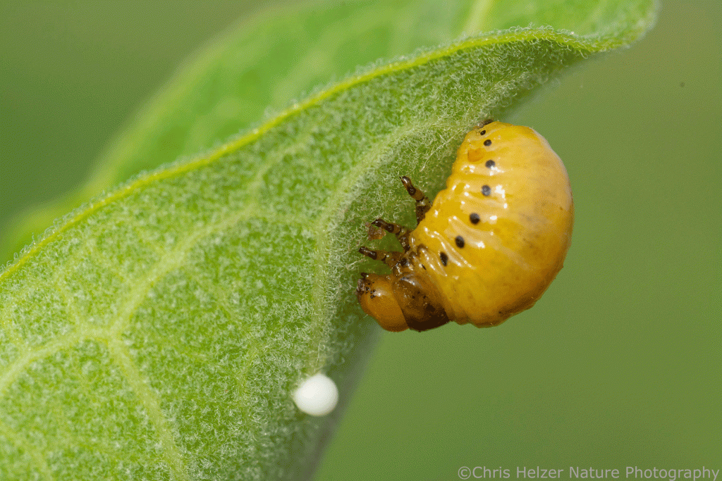 The remaining insects I photographed were members of the exclusive club that have variously evolved strategies for feeding on a plant that is toxic to most others. Monarch caterpillars are in the club but I didn’t find any on this particular day. I did, however, find lots of red milkweed beetles, as well as some milkweed stem weevils and a few milkweed leaf beetle larvae. It’s fun to think about how those insects ended up on this milkweed ‘island’. I assume of the individuals I saw were born right there, but at some point, their ancestors must have struck out on a cross-country trip that ended up leading them to this isolated patch of food plants.