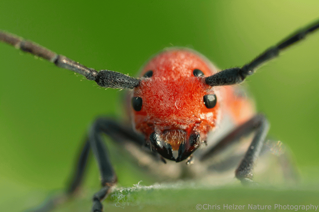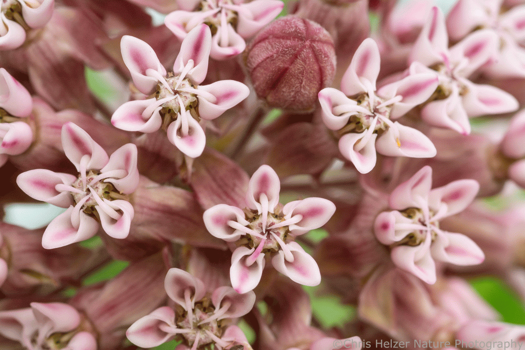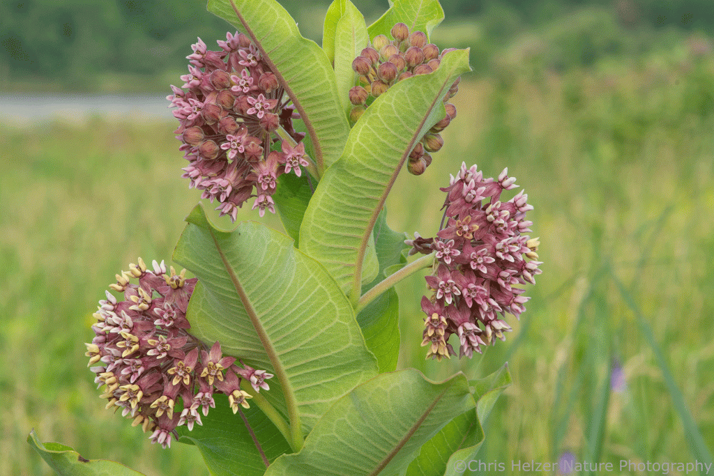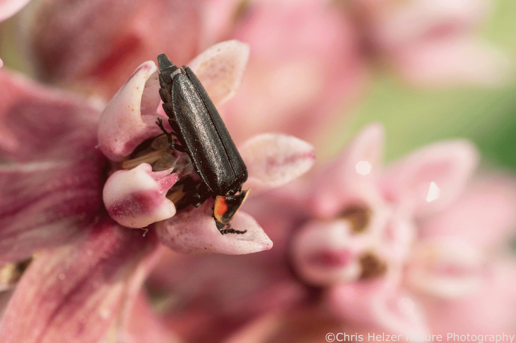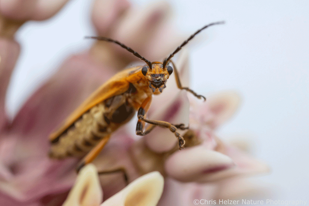 The nectar produced by milkweed flowers attracted a number of small hungry animals, though not many bees or butterflies. Soldier beetles were, by far, the most abundant of those, crawling around the flowers and picking up pollinia (little gel packs of pollen) on their feet. If you aren’t aware of the fascinating story of milkweed pollination, you can read this older post I wrote on that subject. It’s a story worth knowing. Briefly, milkweed pollen is transferred when insects accidentally slide their leg into flower slits, pull out milkweed pollinia, and then slide the same leg and pollinia into the slit of a different flower to complete the process. It shouldn’t work but it does.
