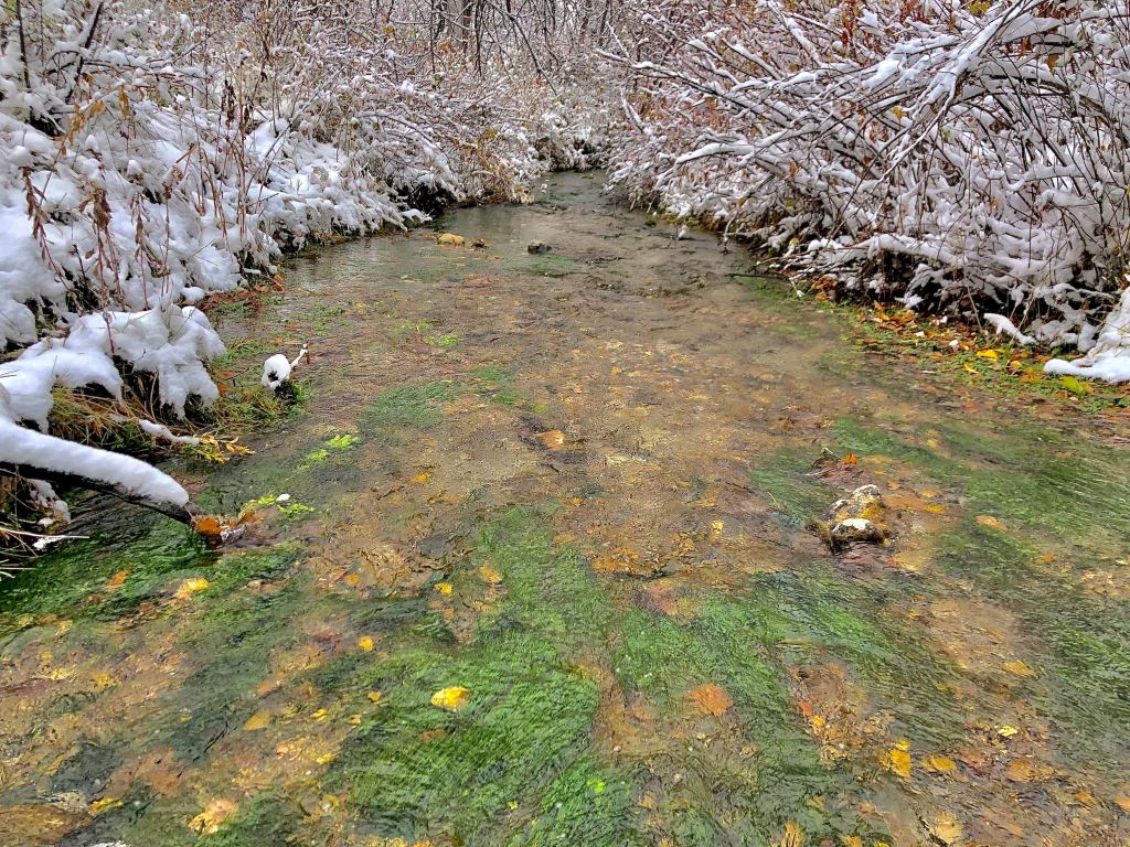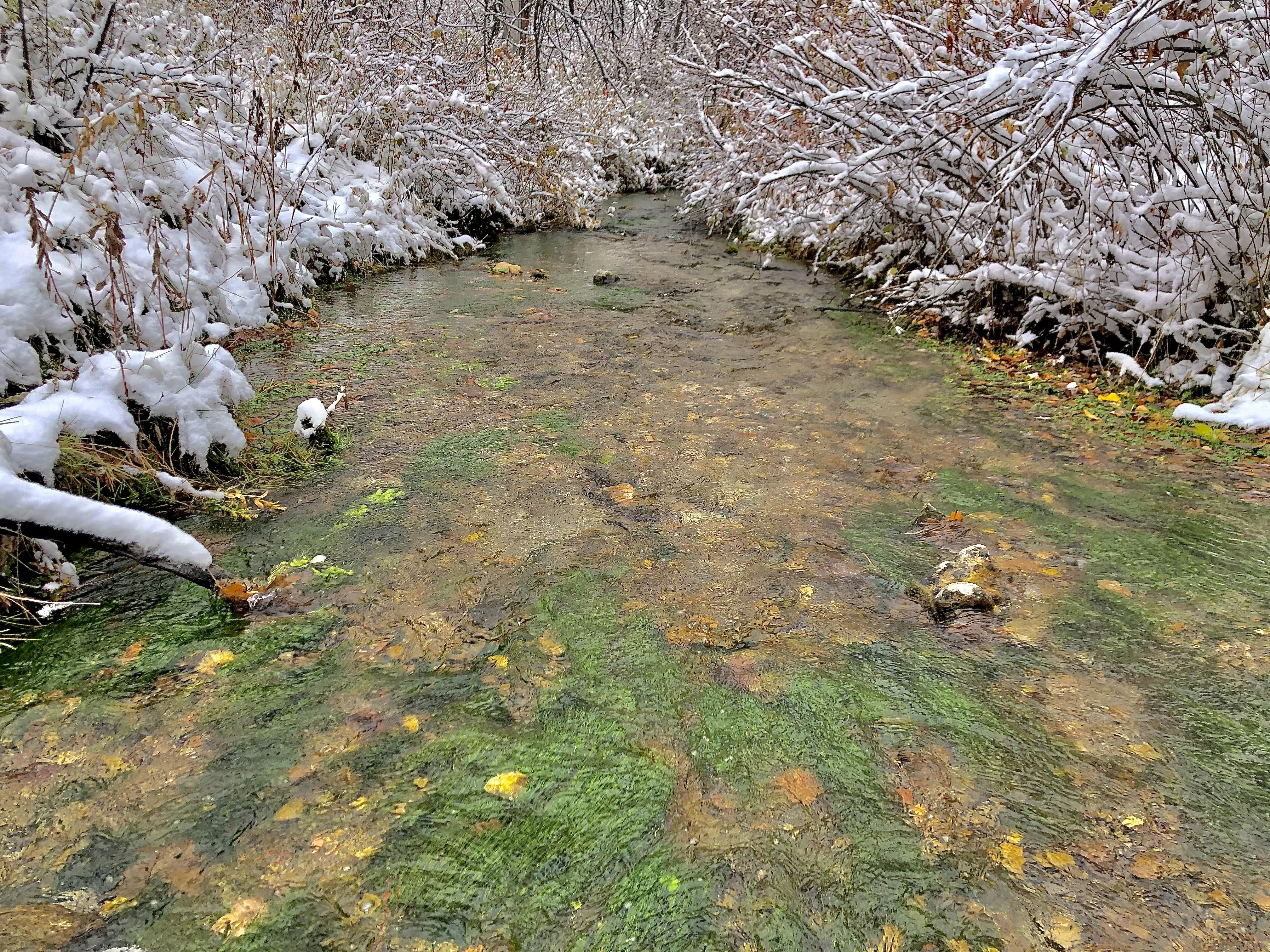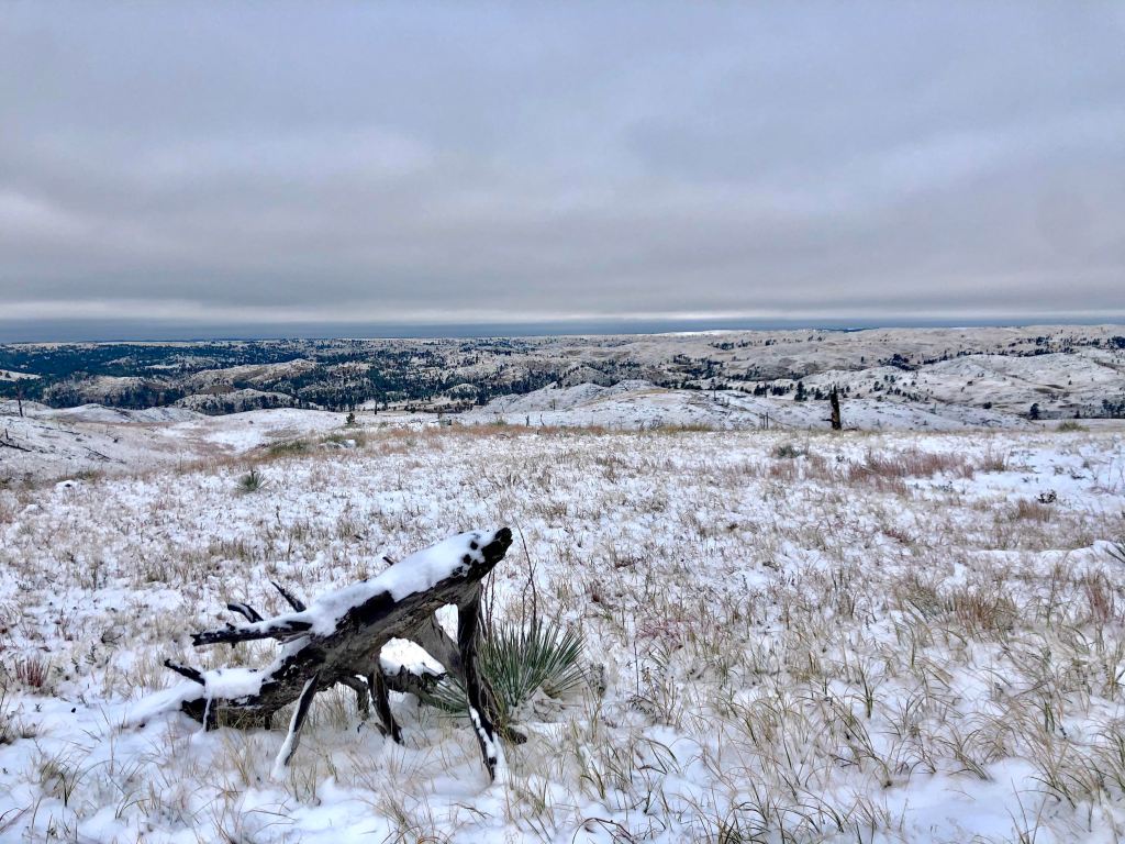 When I woke up the next morning, I was pleasantly surprised by the soft blanket of white that painted the ground and frosted the trees. I packed up camp and eventually made my way to the South Fork Trailhead. Now back at the campground, I proceeded counterclockwise along the Boots and Saddle Trail so I could see the Trooper Trail from the opposite direction. The first mile or so of this trail had several narrow stream crossings with the widest one right at the start of the trail. Inspired by my outlandish dream of becoming an Olympic long jumper or really just someone who could touch a basketball rim, I “elegantly” clambered my way across each crossing. Once I was out of the lowlands, I returned to the top of the world with rolling hills and valleys extending far beyond what I could see.