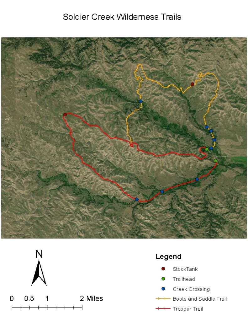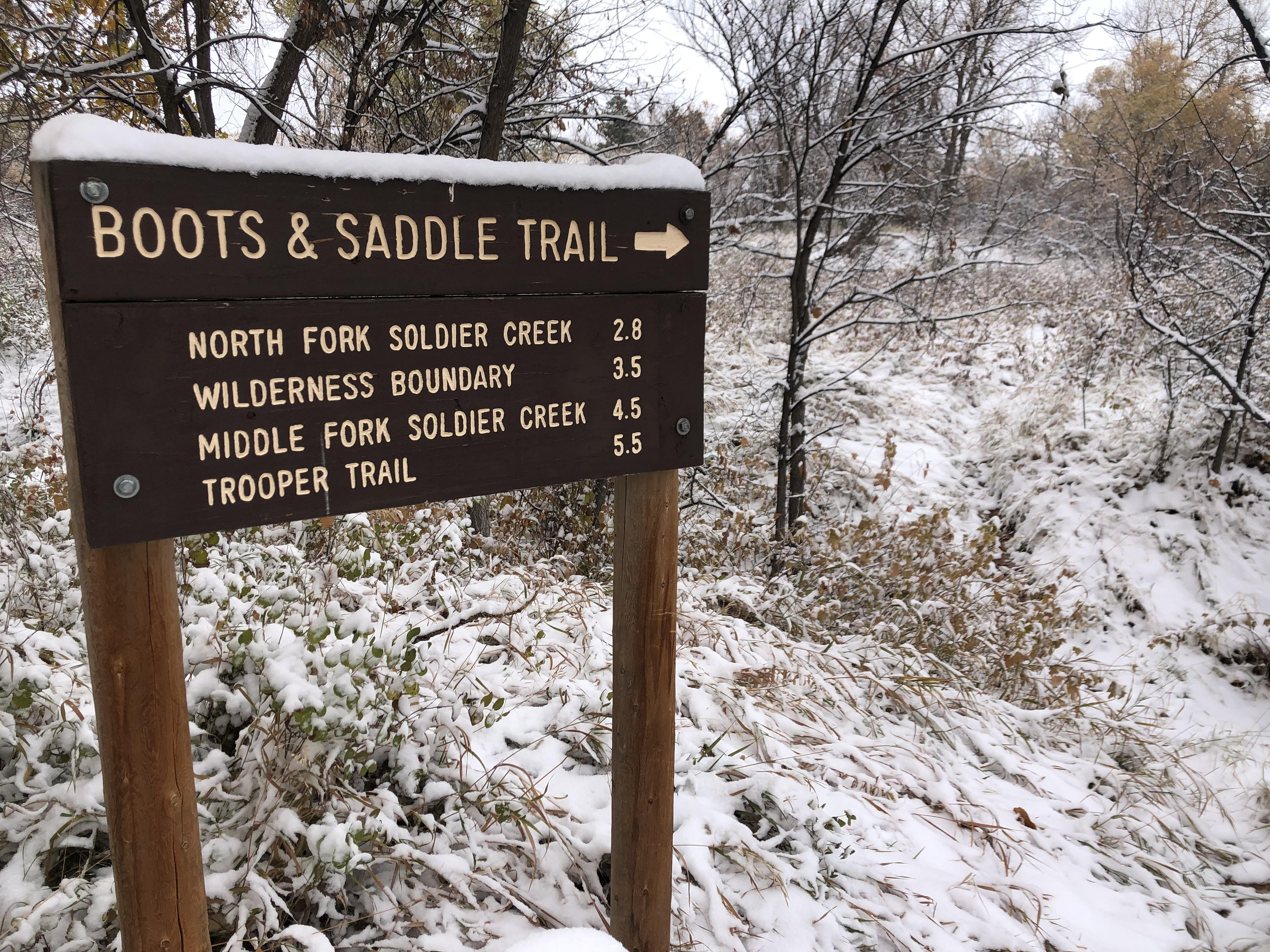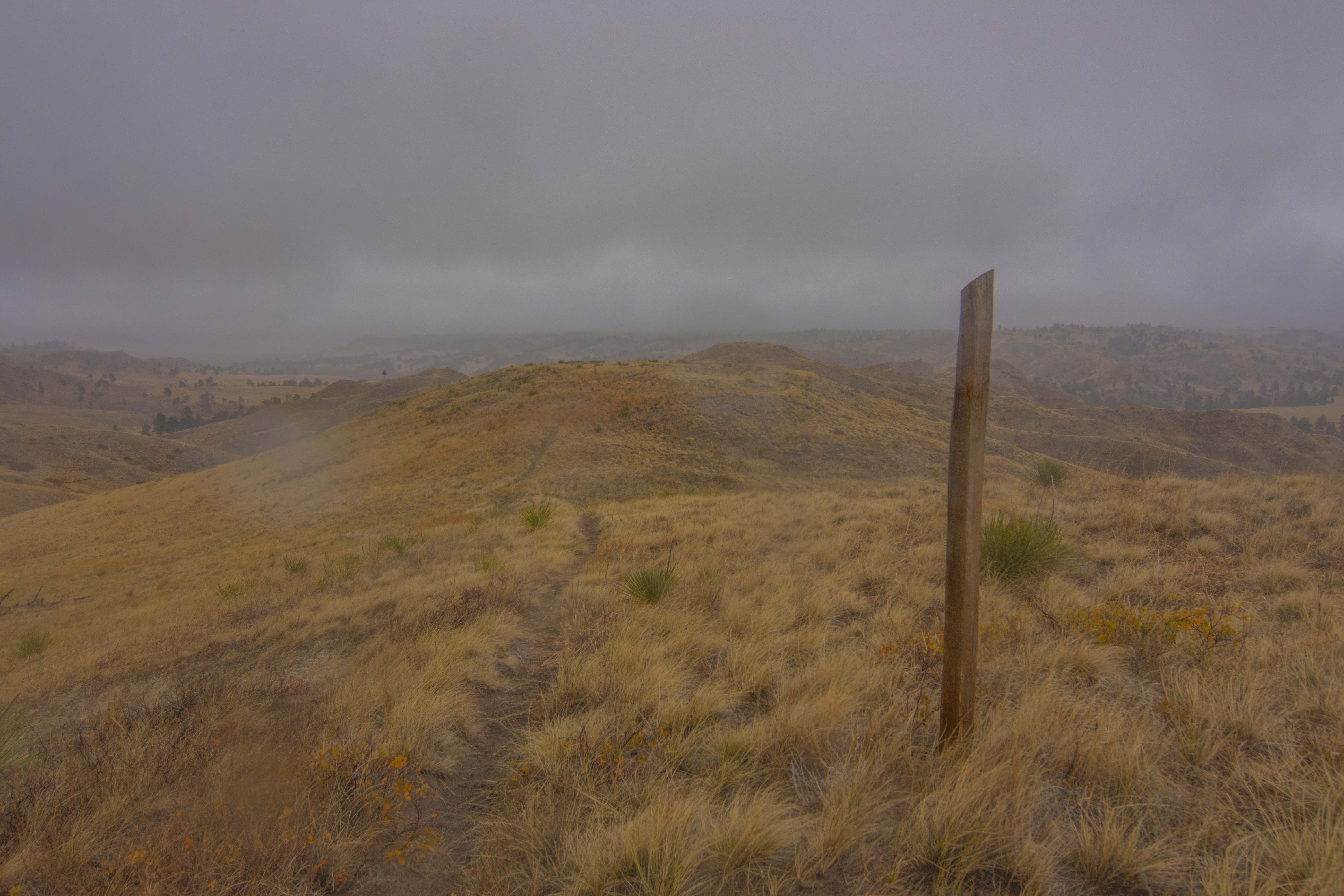 Wooden posts are the trail markers. It’s important to always be on the lookout for these posts, especially on the Trooper Trail, because sometimes the “trail” ends up being a cattle path or vehicle 2-track. The Boots and Saddle Trail, to me at least, seems to have more hoofed traffic so the path is clearer. I’ll admit that I lost the path several times but was able to find wooden markers to guide my way back.