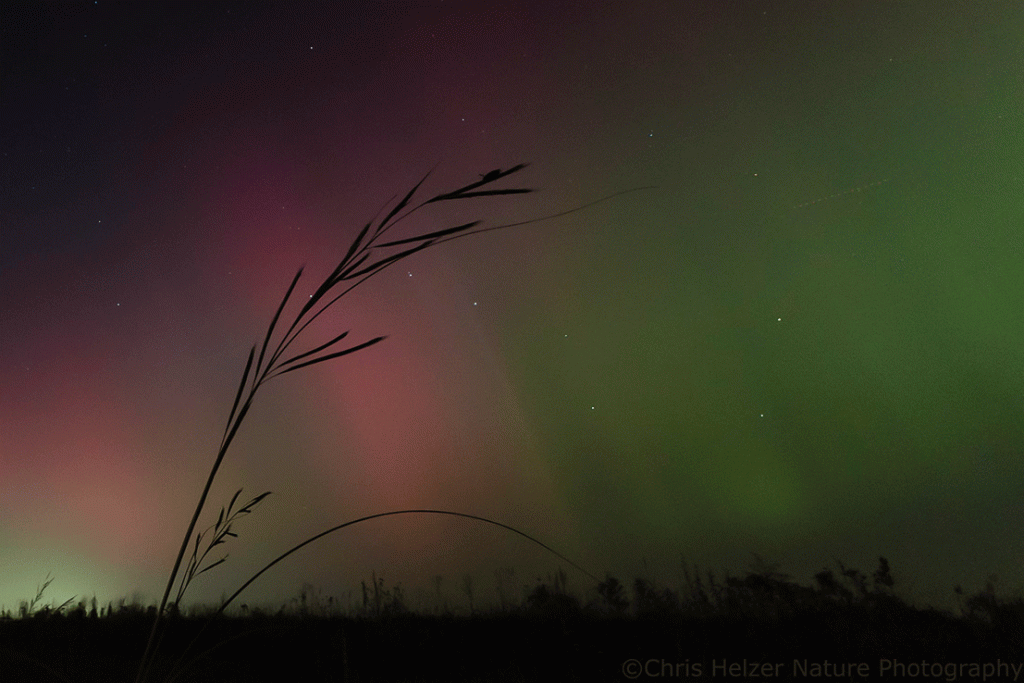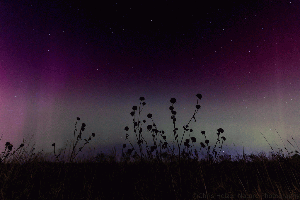 Lots of people in central North America got to see the northern lights this fall. If you’re on any form of social media, you surely saw many results of people’s excited trips out to places dark enough to provide a decent view of the colored sky. The night of the best views, I’d just returned from a work trip and felt tired and a little under the weather (no pun intended). I hadn’t decided whether I was going to venture out, but Kim drove out of town and sent me a photo of a little purple light in the sky.