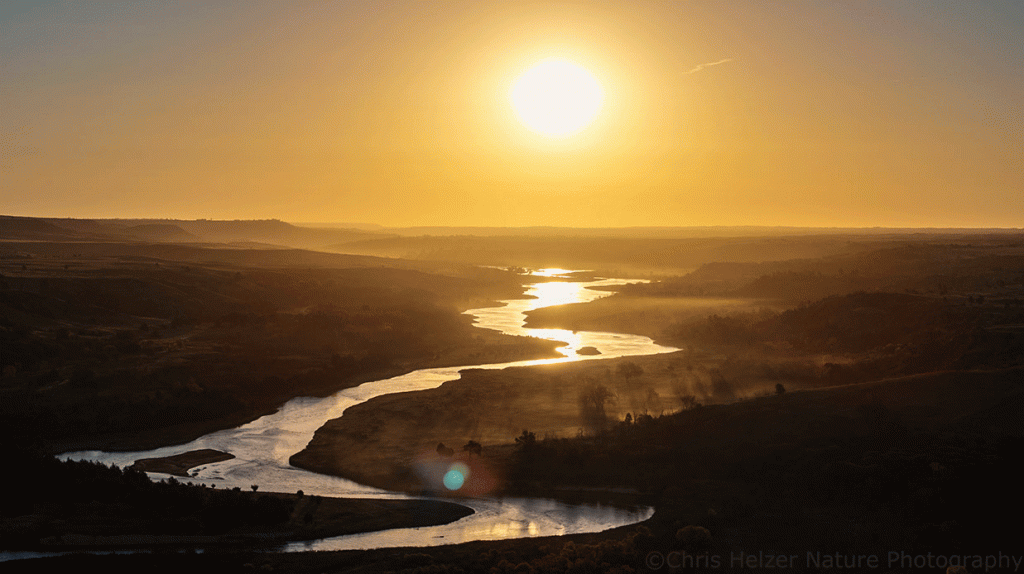 The morning after I photographed the comet, we arrived at the bison corral just as the sun was coming up. While the experts in charge of the proceedings worked through some final corral preparations, I took my drone up into the air to capture the sun rising over the Niobrara River.