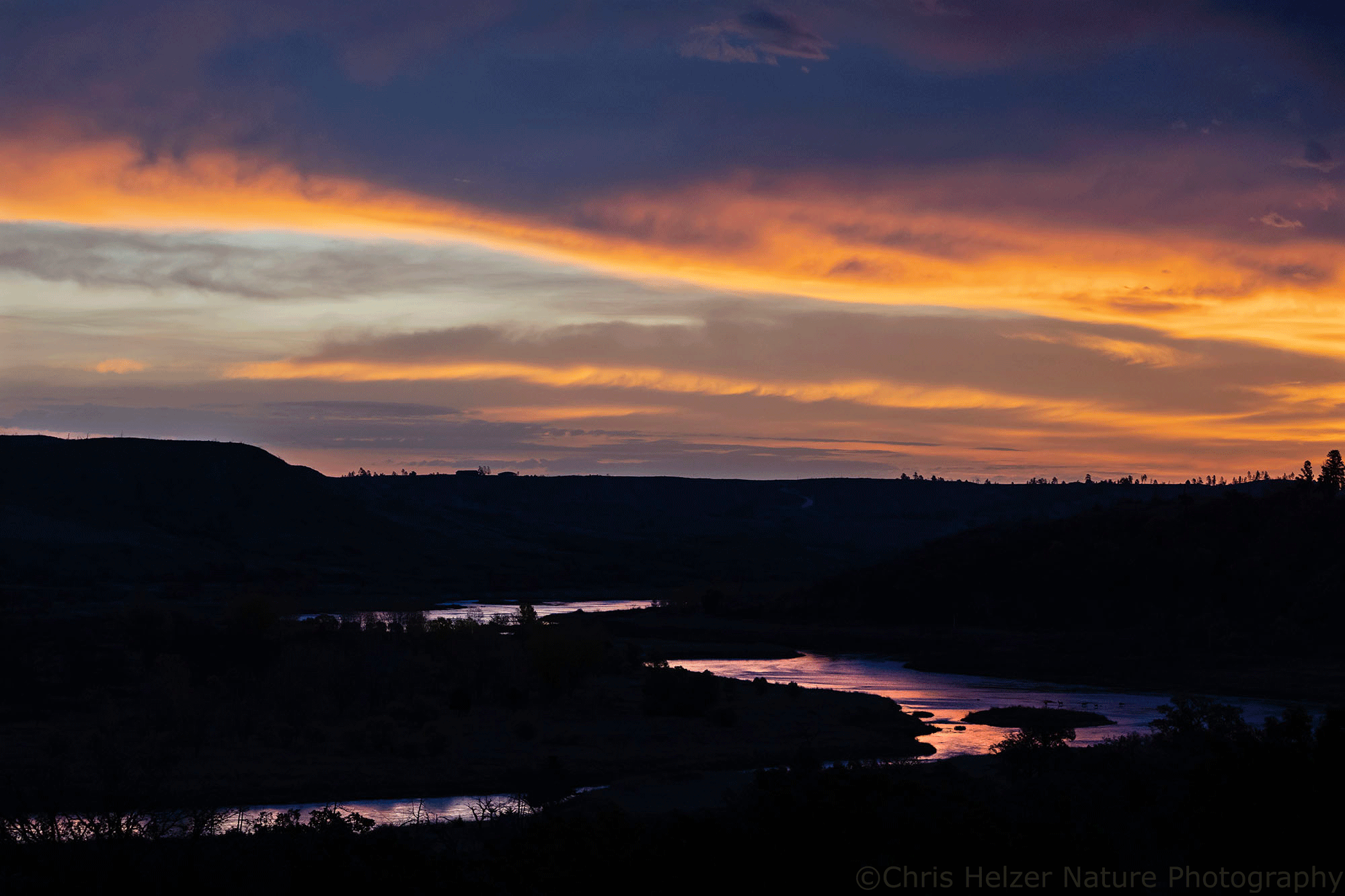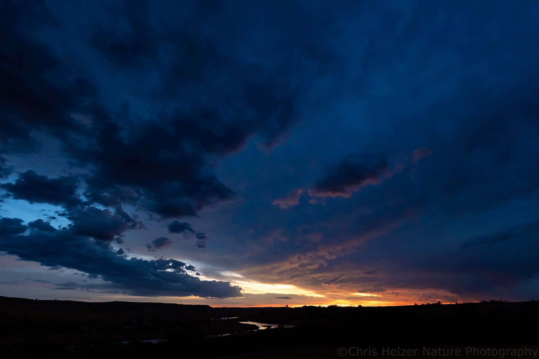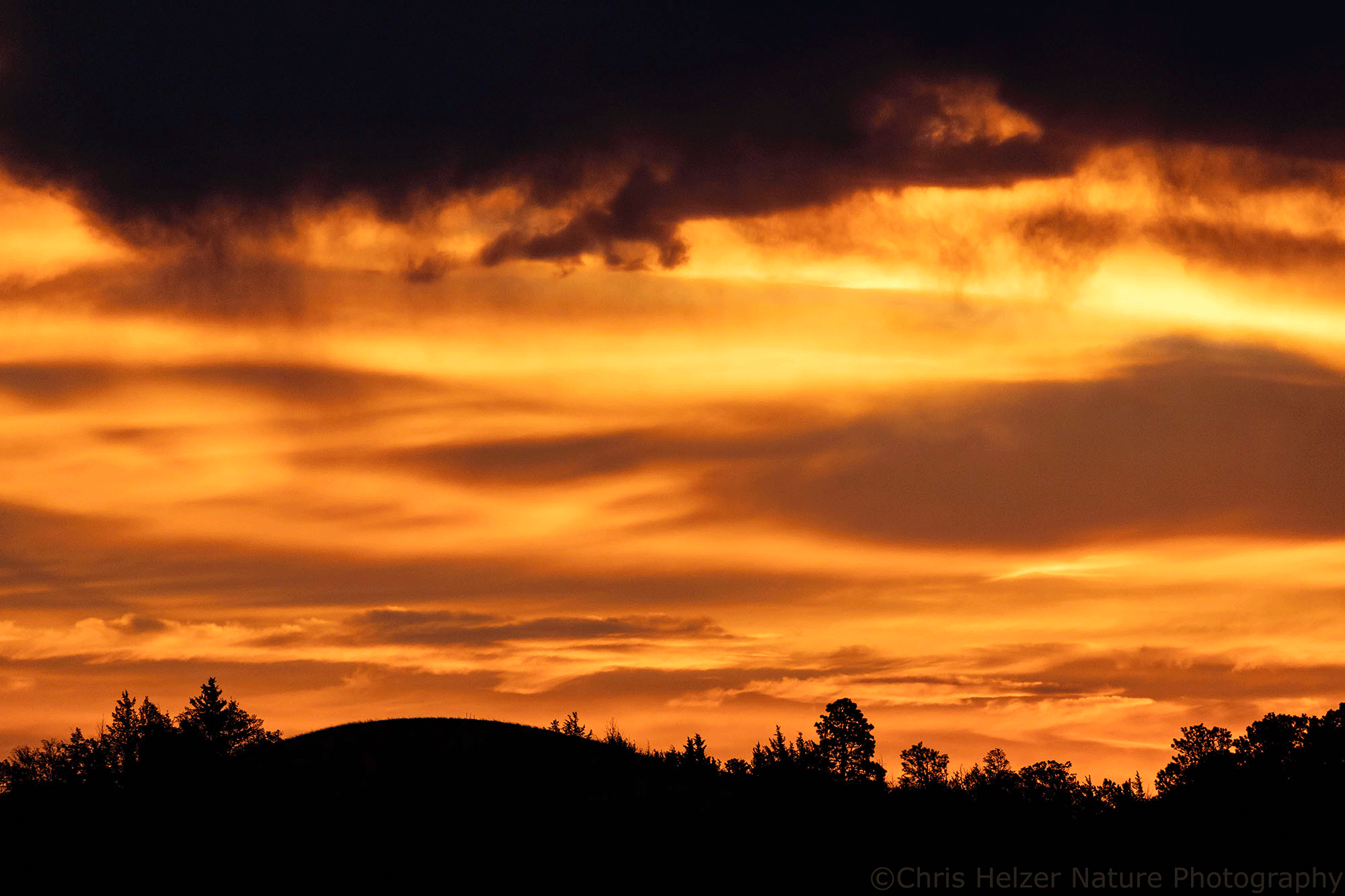 Just before sunrise on Monday morning, I was back up at my favorite vantage point at the Niobrara Valley Preserve, watching a ribbon of orange light illuminate the horizon and bleed into the dark blue/gray of the clouds above. I spent more than a half hour bouncing around a hillside, changing lenses several times, and lying on the ground in multiple places to get the angles I wanted. There were way too many choices for how to capture the scene and I wanted to take advantage of as many as I could.