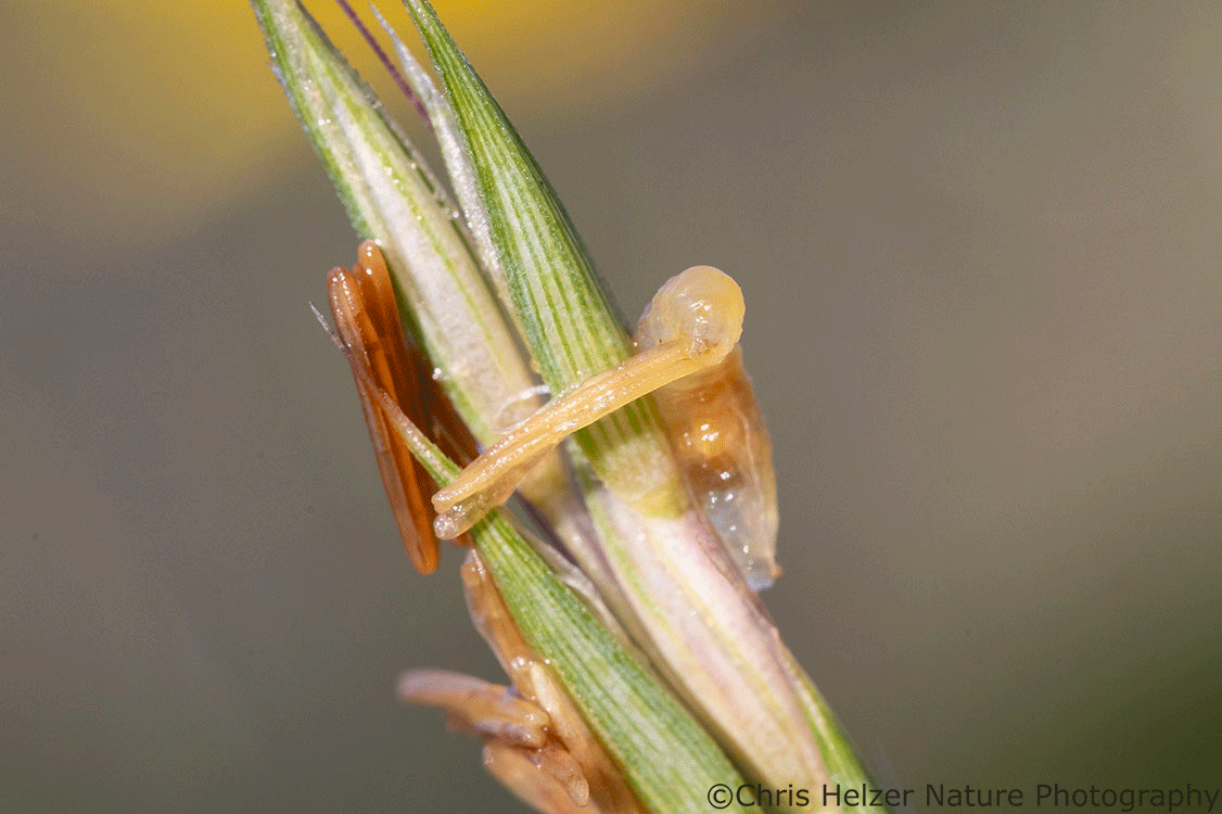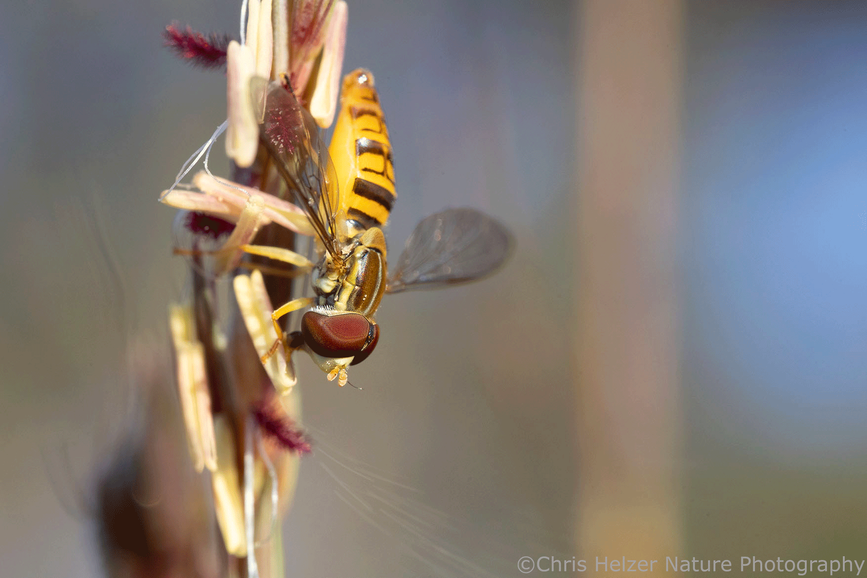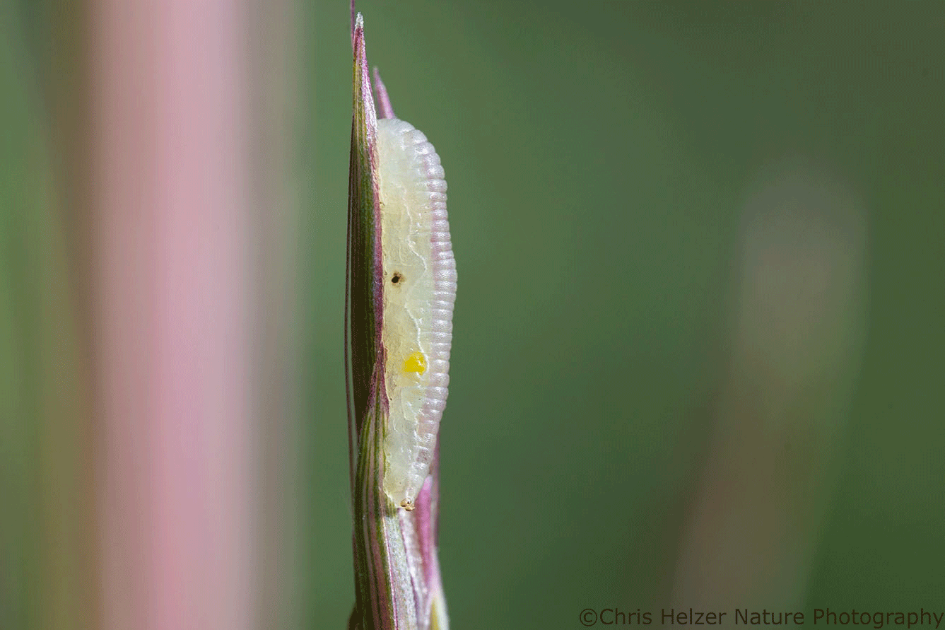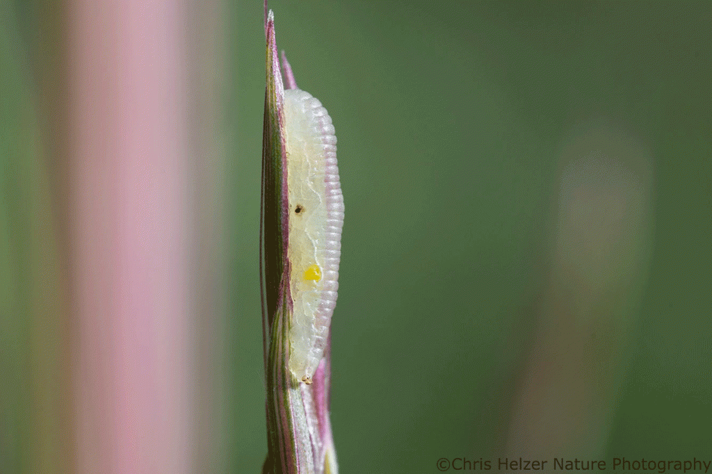 I’d known that Syrphid fly larvae were predators, so I didn’t even think about them when I wondered what the tiny pale larvae were that crawl around on big bluestem flowers. I’ve seen those little larvae for years, and even have a few photographs of them. But it wasn’t until I photographed them in the plot and submitted the photos to bugguide.net that I learned what they were.
