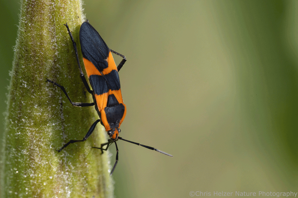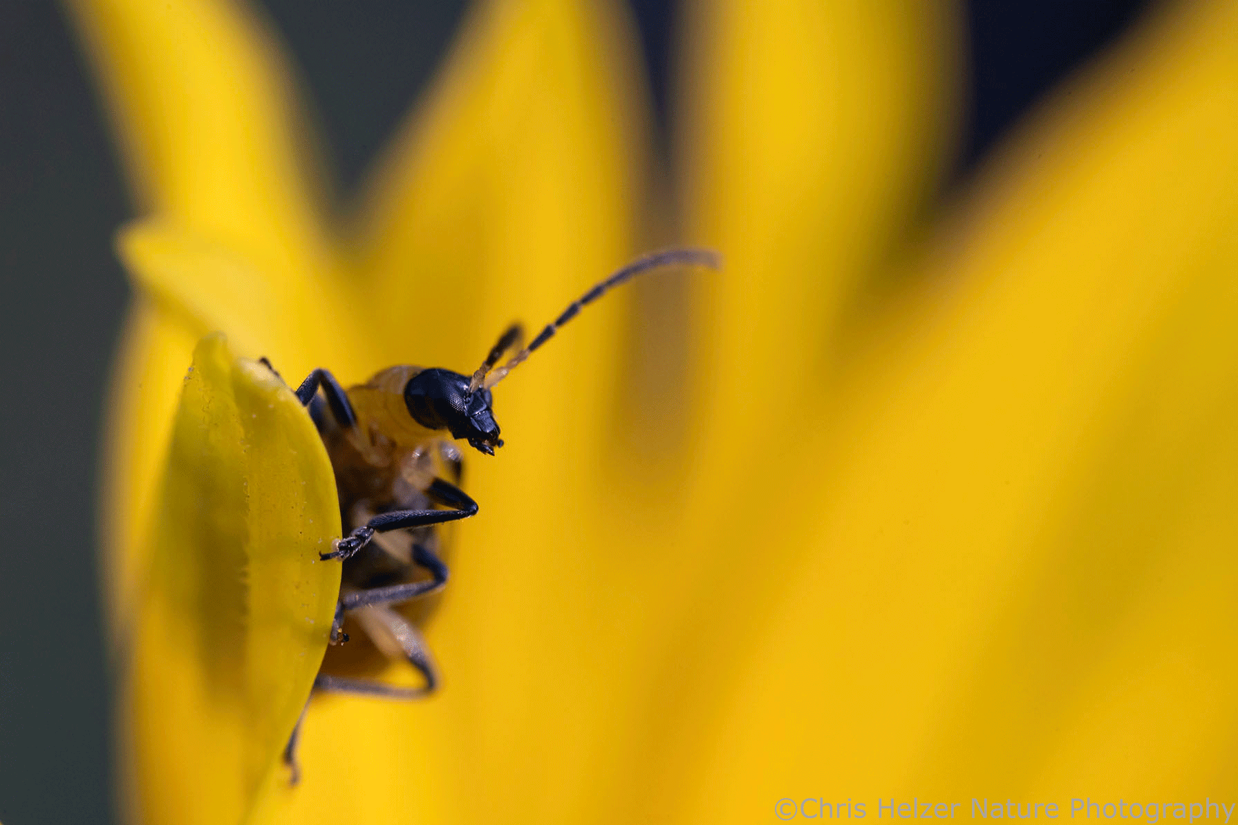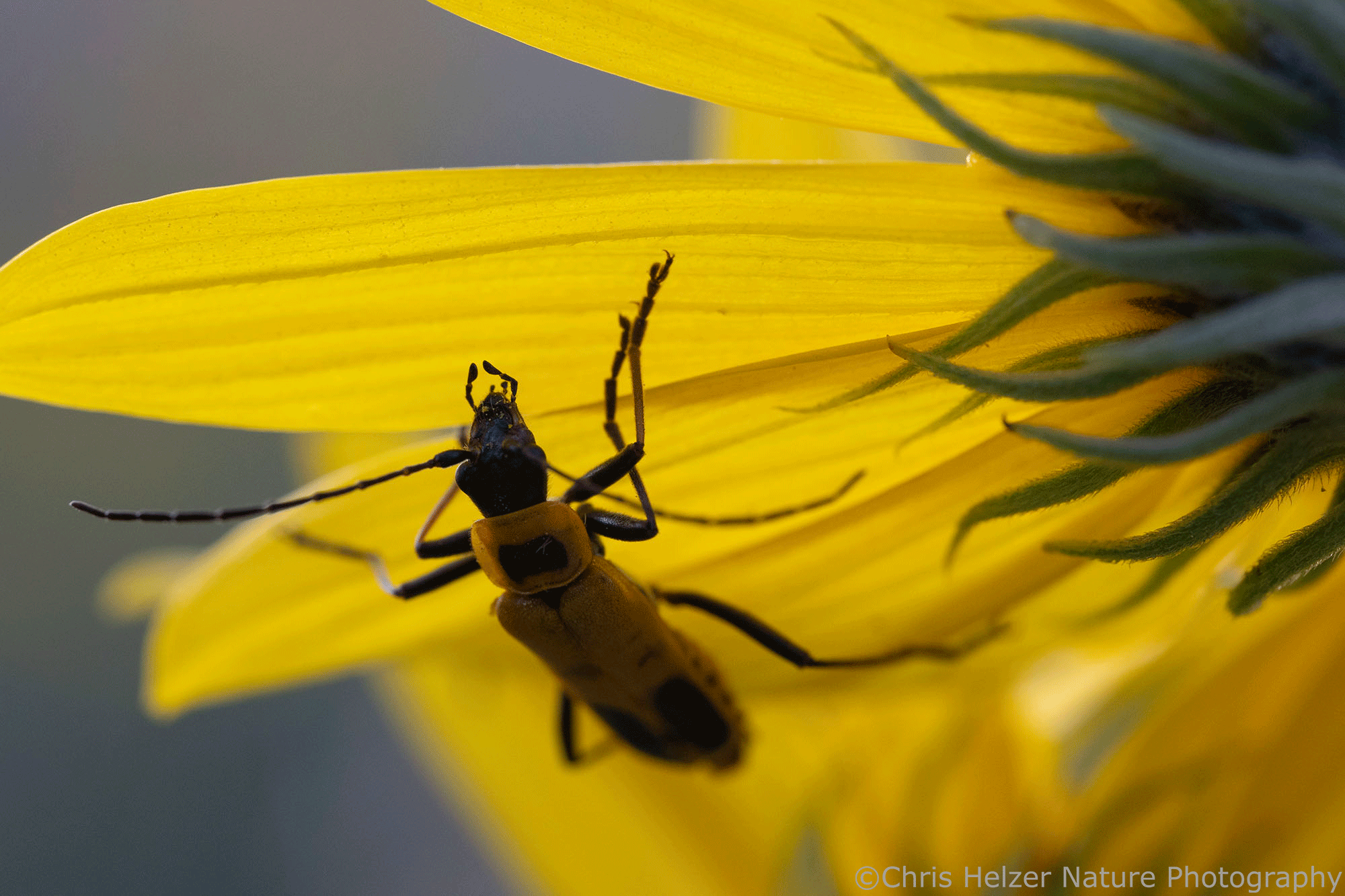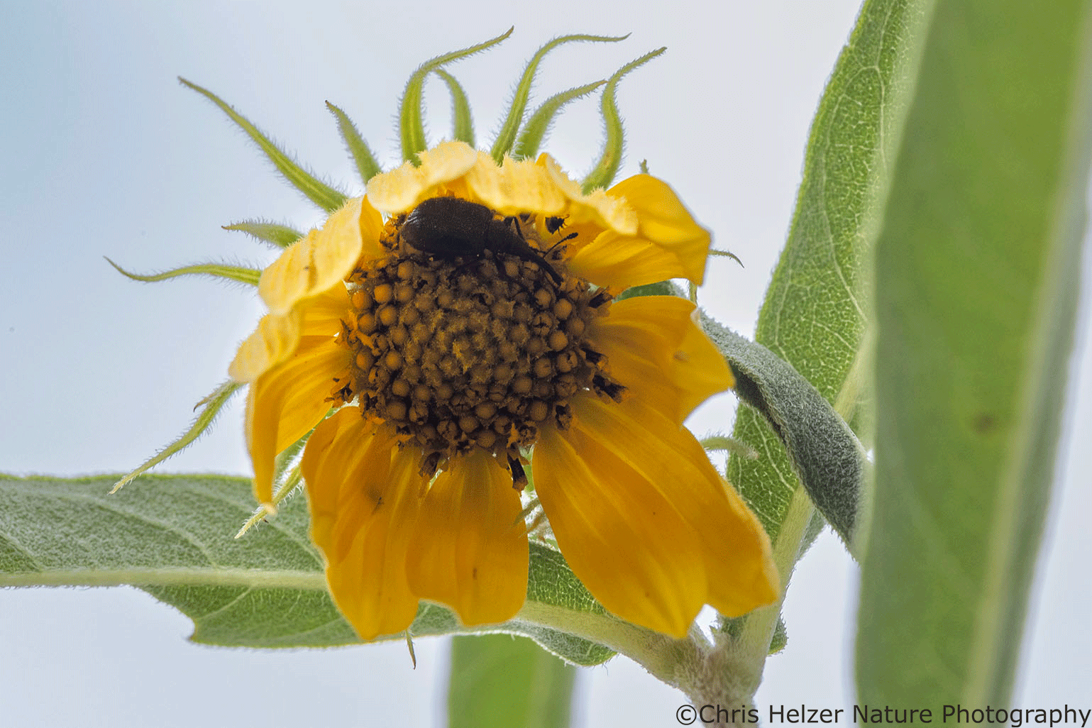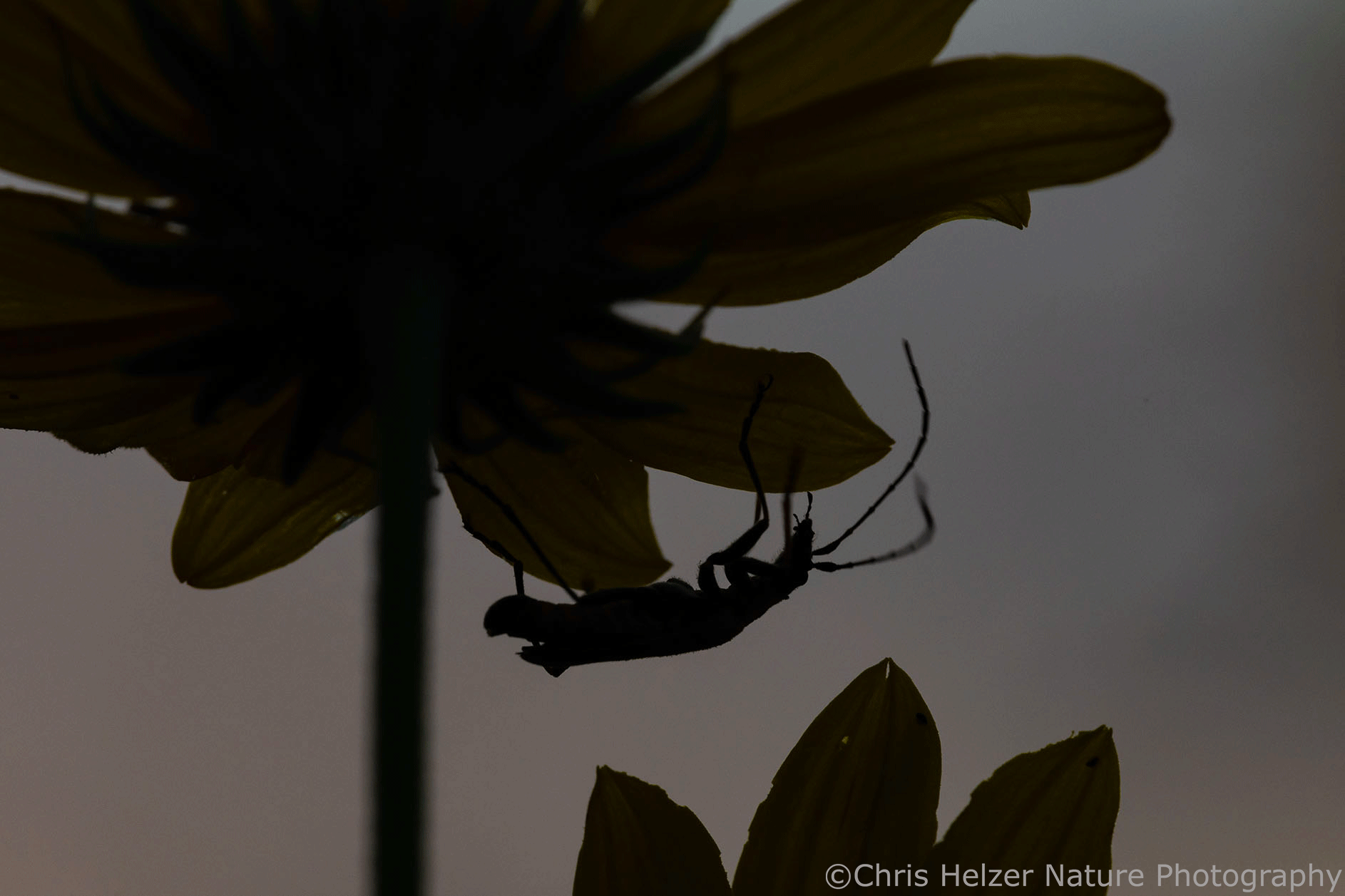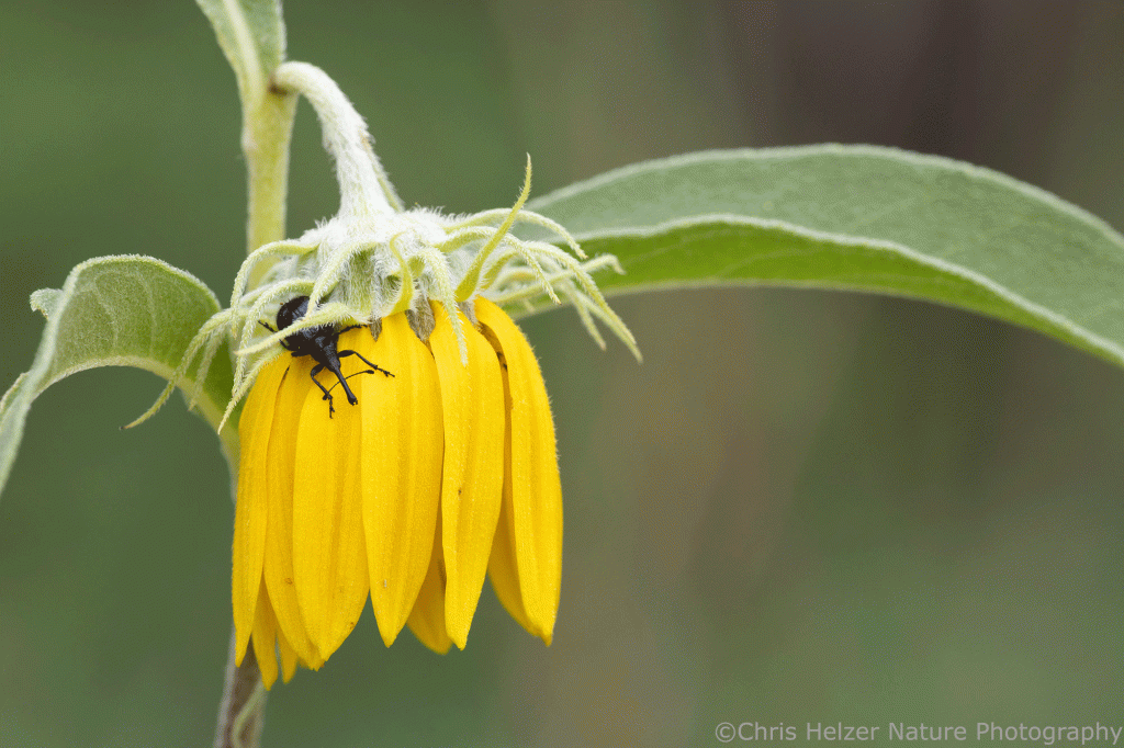 I’ve photographed what I think are head-clipping weevils several times this year, but last week, I was finally able to photograph one in the tipped-down flower head itself. The logistics of that weren’t easy because the flower was about two-and-a-half feet off the ground, so I had to lie on the ground with my upward-pointing camera on a tripod. Then, I had to somehow lift myself up with one hand while trying to both focus and activate the shutter with the other. All this happened while I was staring into a bright sky and trying to see what was inside the deep shadows of the upside-down flower.