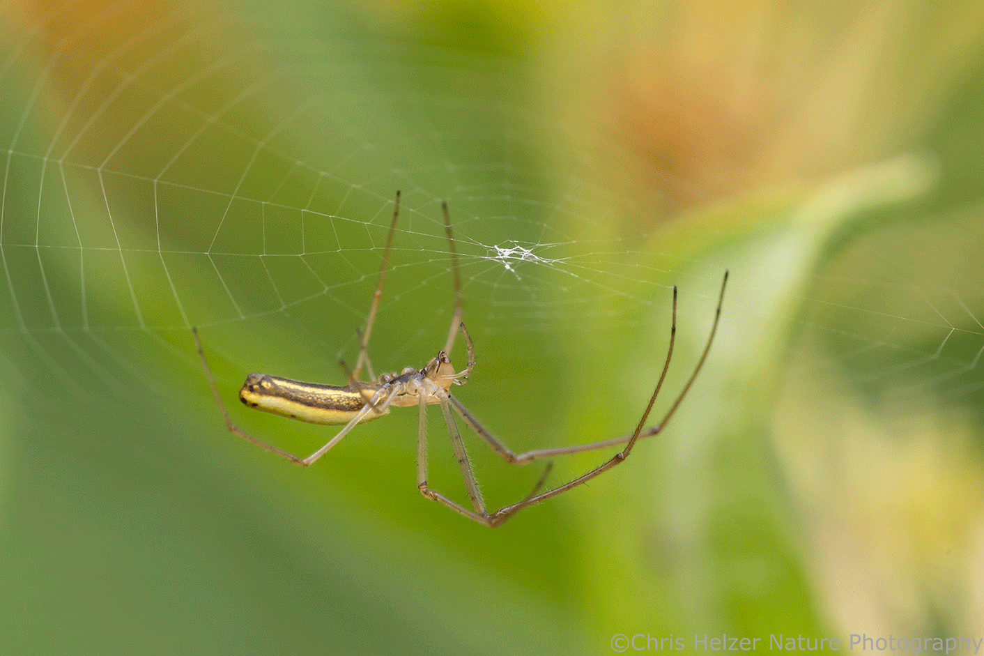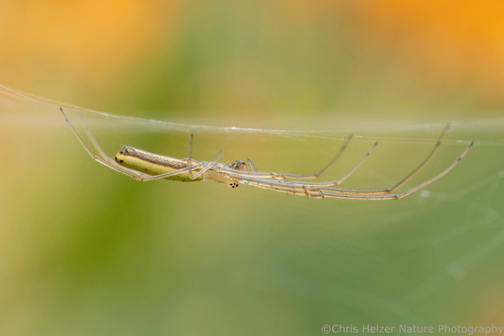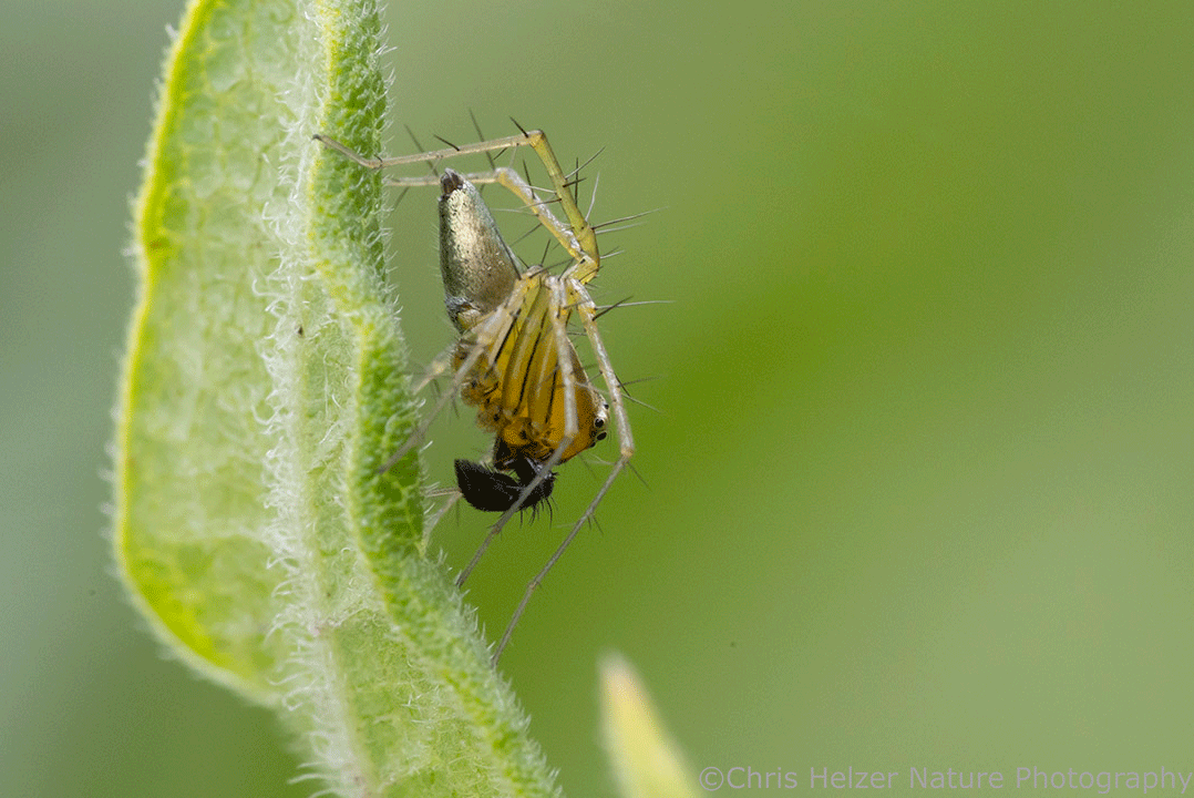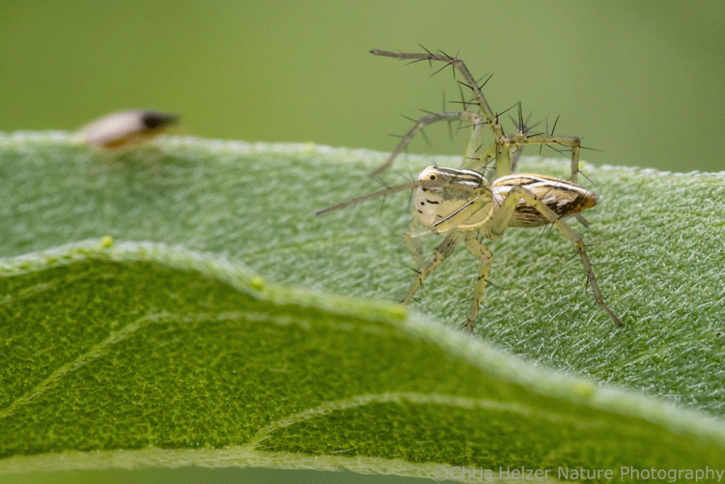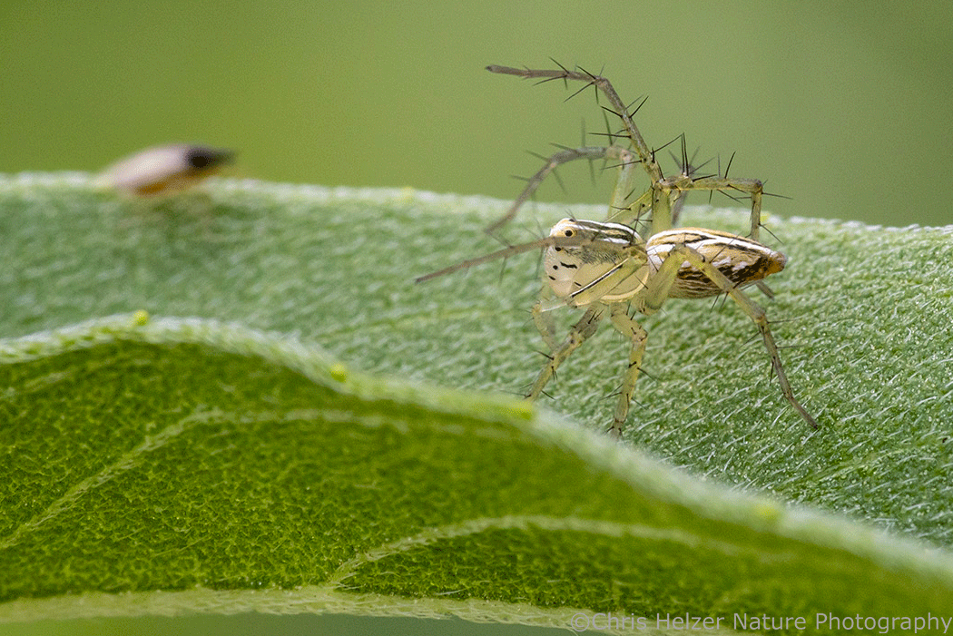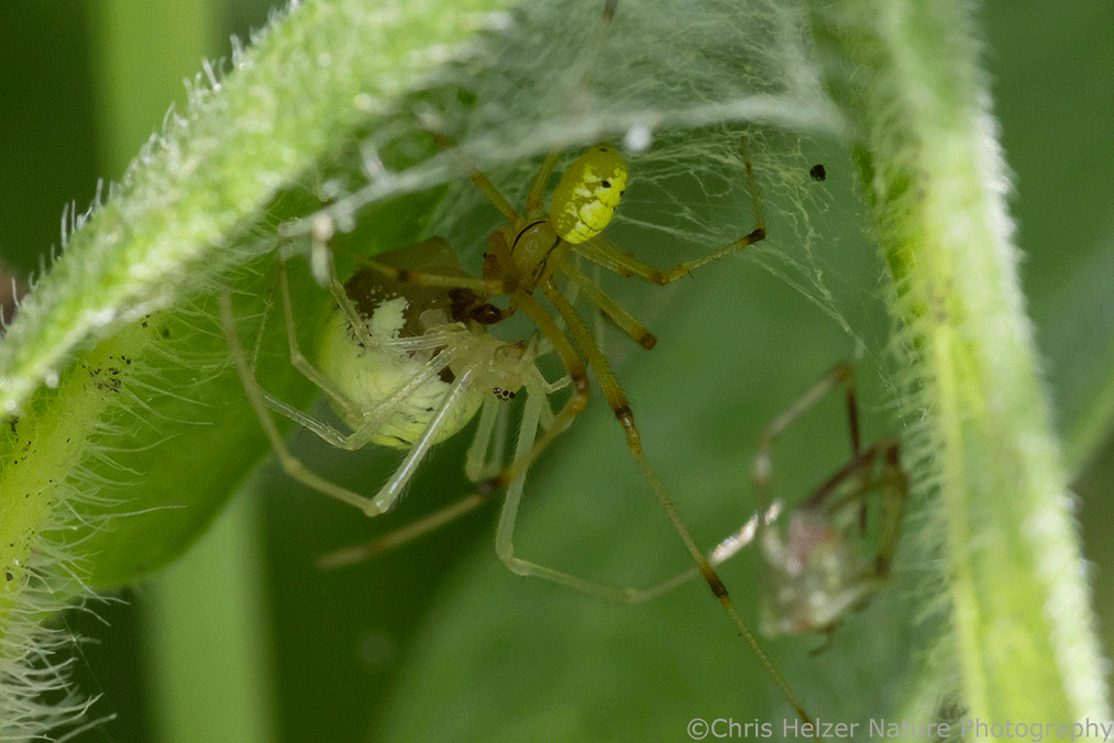One morning, I noticed a spider with a big white bulbous abdomen in a tent-like shelter made out of a bent butterfly milkweed leaf and some silk. It was only a few inches from the ground, so it took a while to get myself positioned to photograph her. Once I was there, I ended up staying for about 15 minutes. As I watched, a much smaller male approached and ended up successfully (as far as I could tell) mating with the female and then escaping with his life.