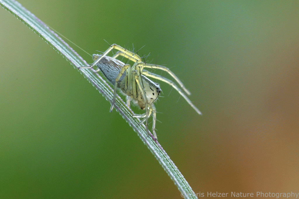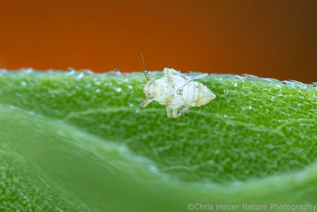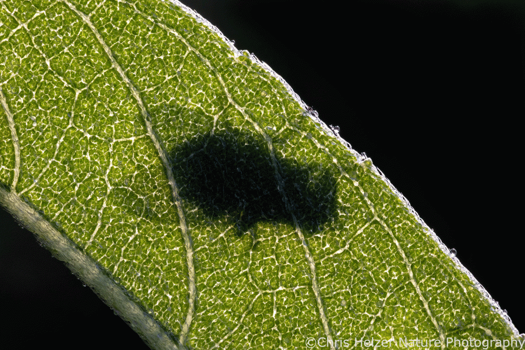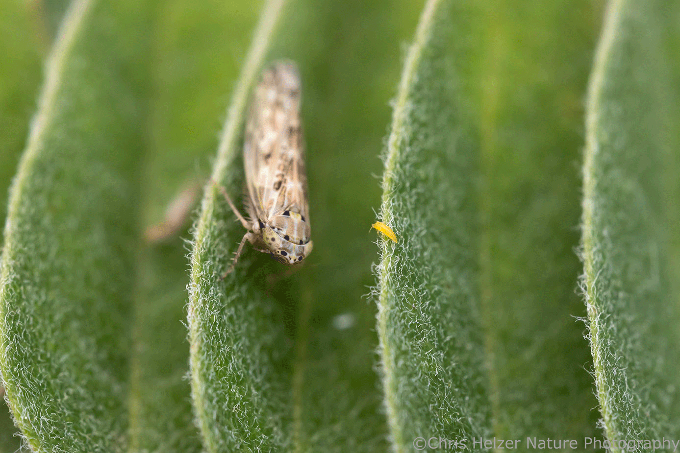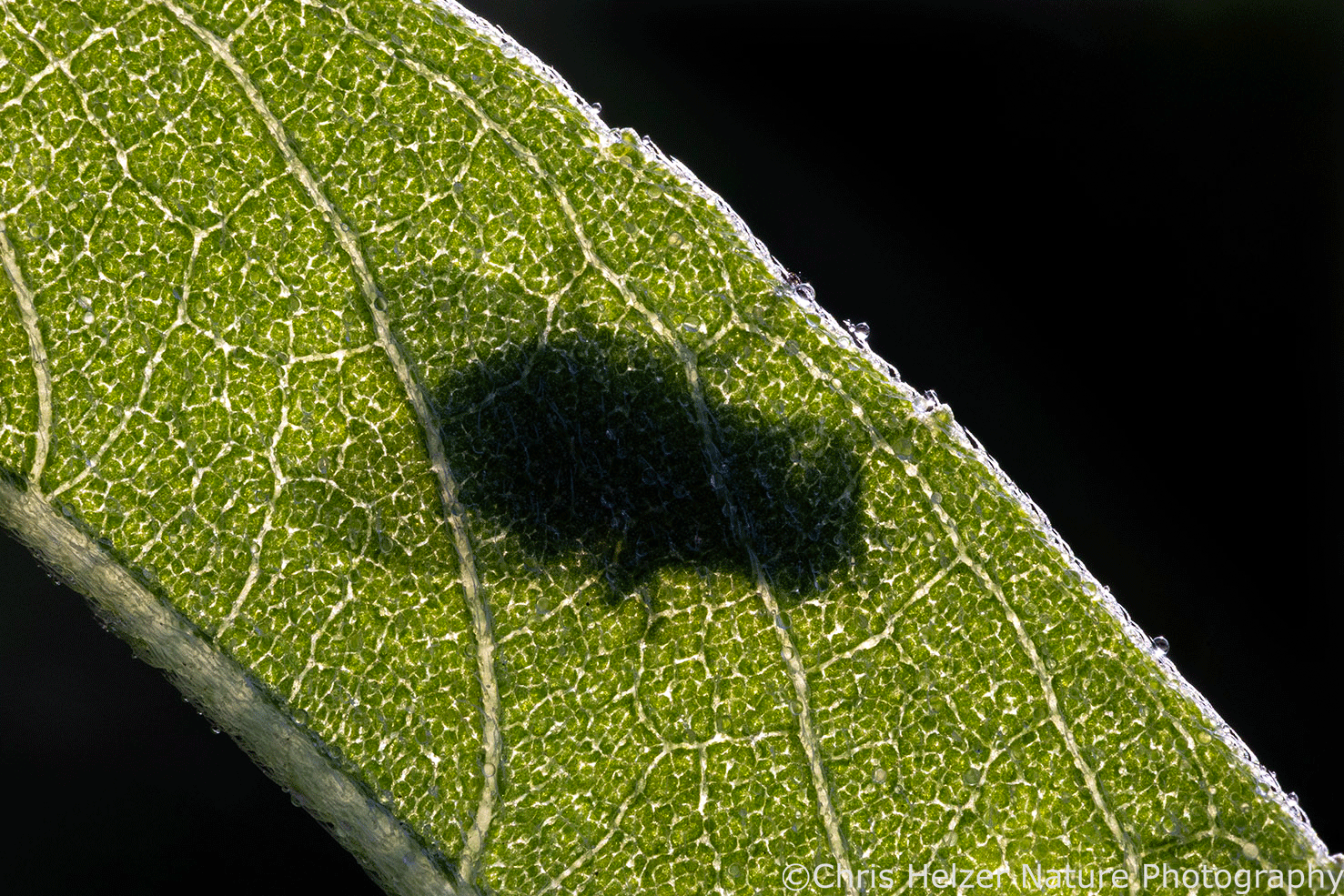 One morning, I noticed a spider with a big white bulbous abdomen in a tent-like shelter made out of a bent butterfly milkweed leaf and some silk. It was only a few inches from the ground, so it took a while to get myself positioned to photograph her. Once I was there, I ended up staying for about 15 minutes. As I watched, a much smaller male approached and ended up successfully (as far as I could tell) mating with the female and then escaping with his life.