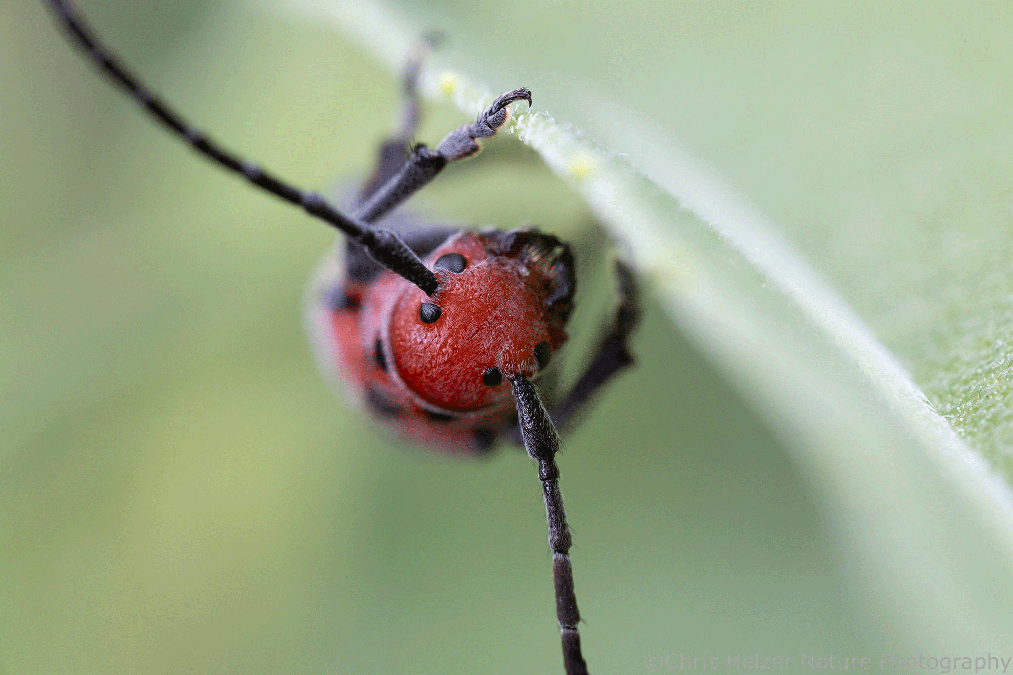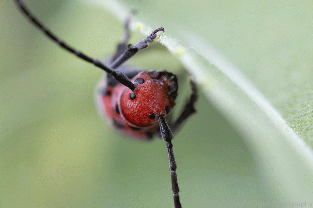 I’ve seen red milkweed beetles (Tetraopes tetrophthalmus) several times, and have photographed at least three of them, but only one of those was actually on milkweed at the time. The other two landed on Maximilian sunflower and hung out while I crept up on them with my camera. They’re awfully charismatic, which is why one of them was featured on the cover of the book I wrote about my 2018 version of this project!