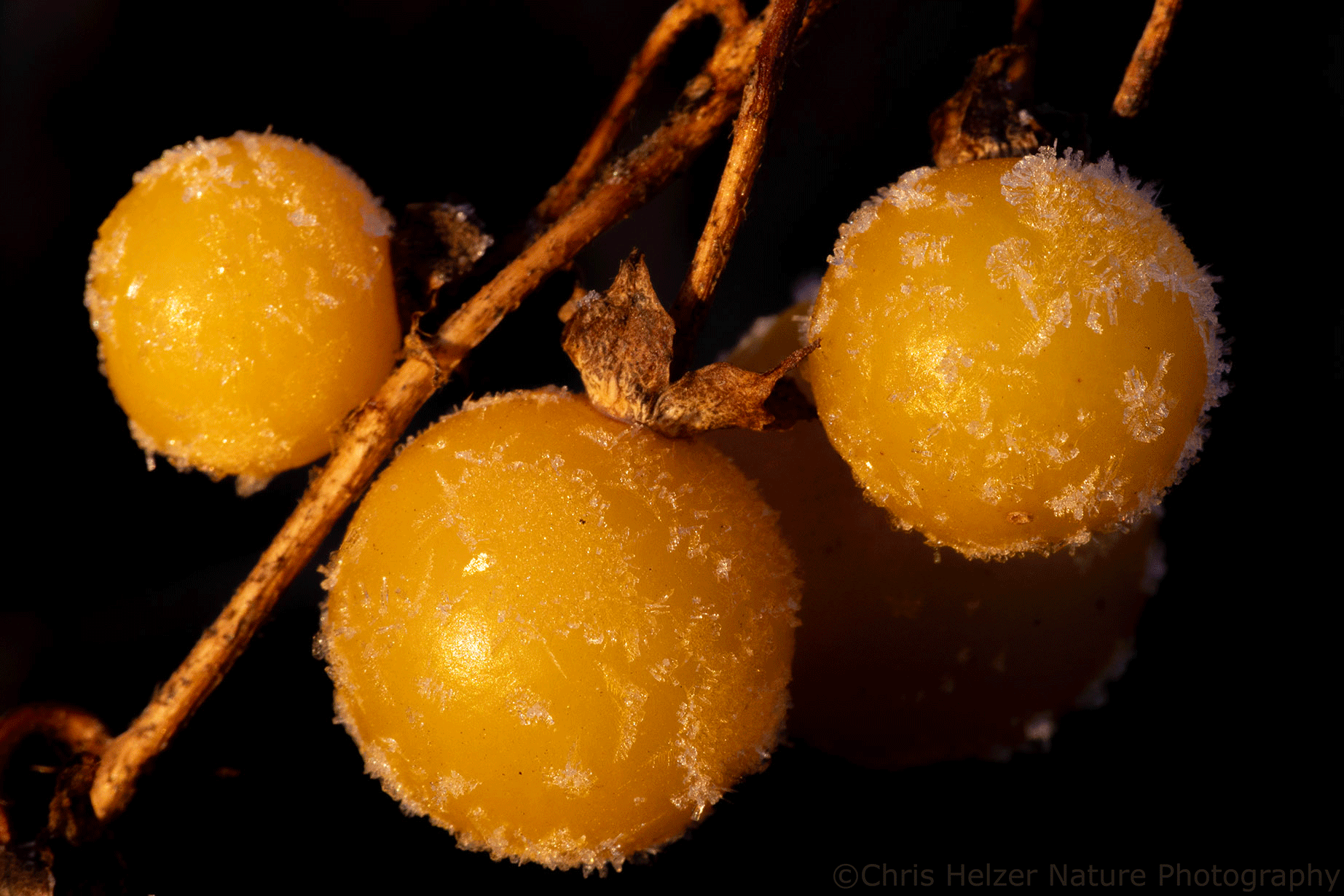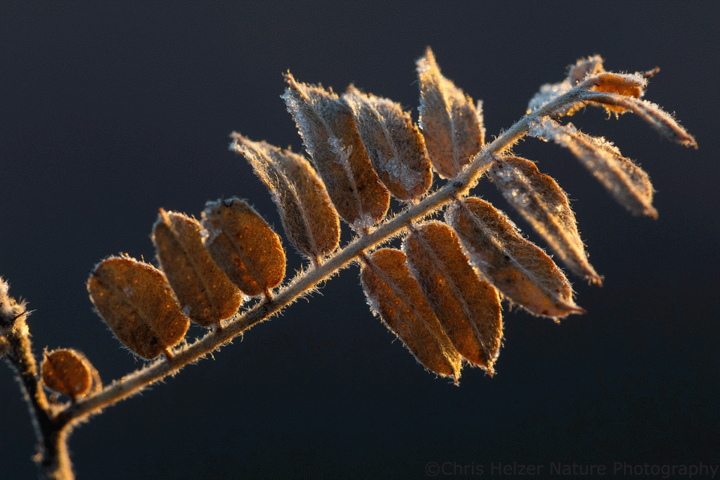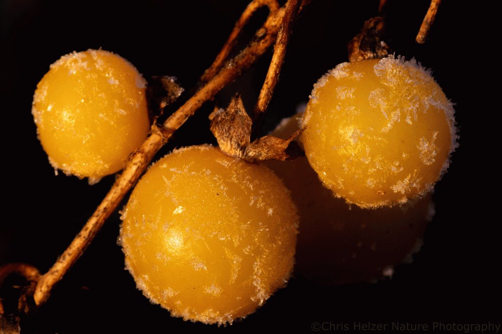 Lead plant leaf and frost. Lincoln Creek Prairie, Aurora, Nebraska. Canon 180mm macro lens. ISO 1000, f/9.5, 1/60 sec.Carolina horse nettle fruits and frost. Lincoln Creek Prairie, Aurora, Nebraska. Canon 180mm macro lens. ISO 1000, f/9.5, 1/60 sec.