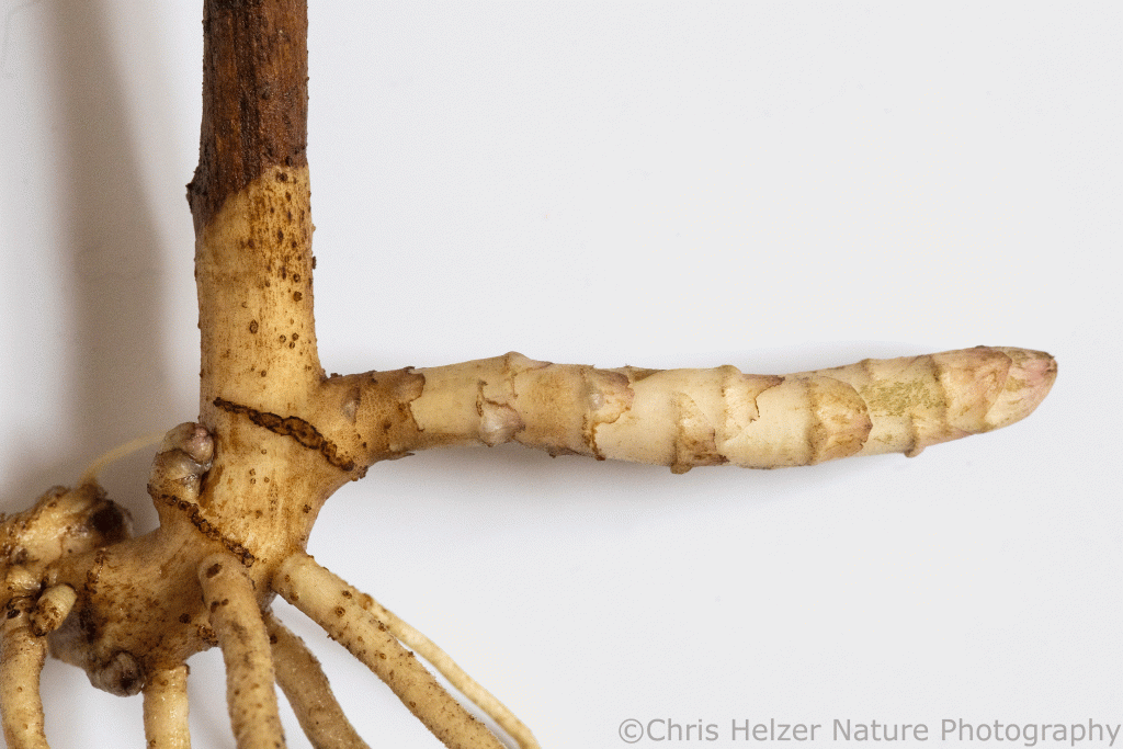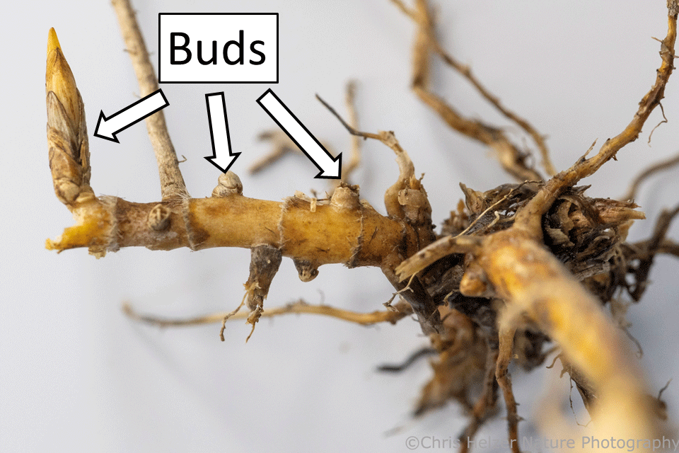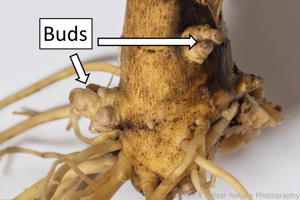 This photo of stiff goldenrod (Oligoneuron rigida) shows some buds (left) and a rhizome (right) that definitely doesn’t look like anything else, regardless of what you might think.
