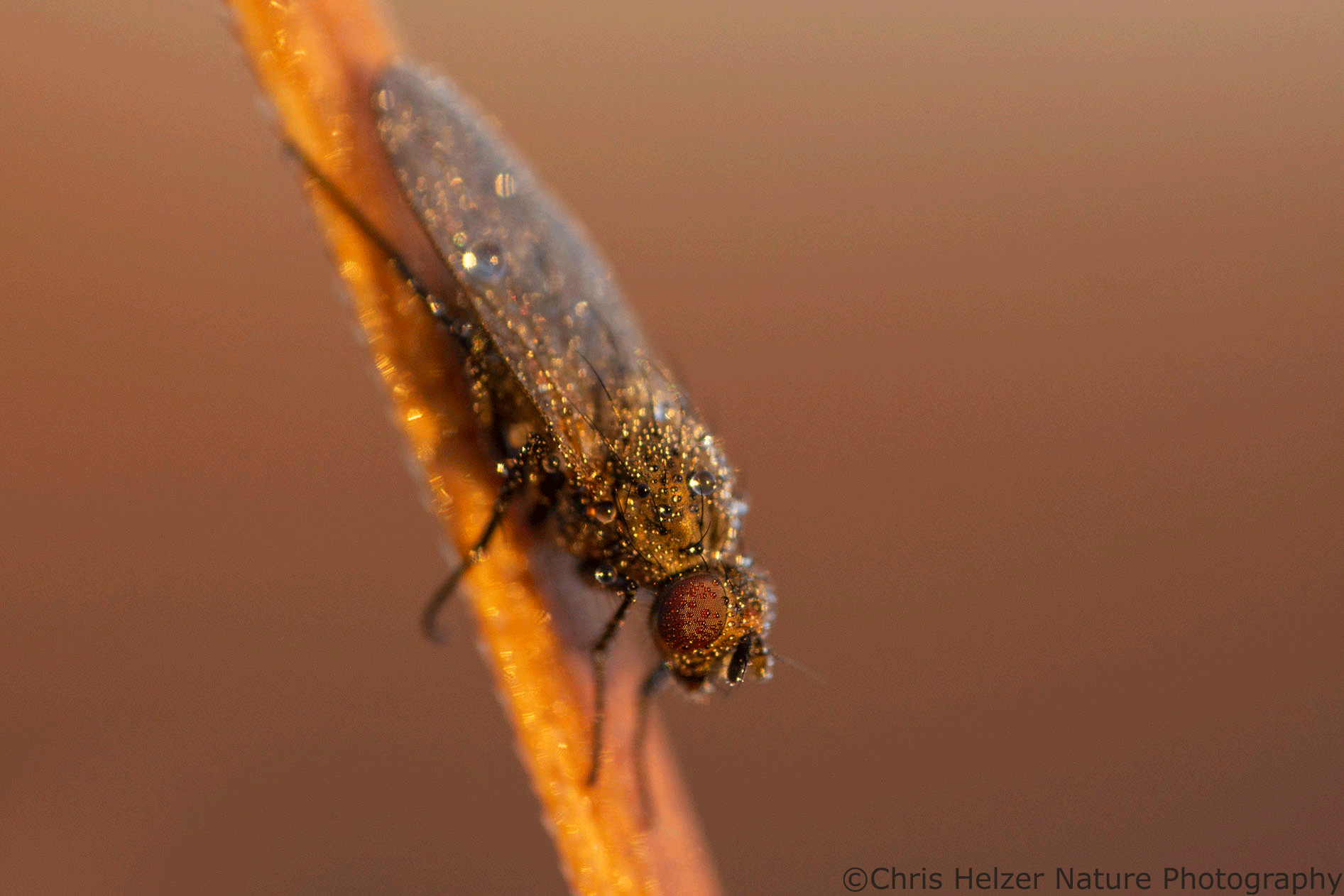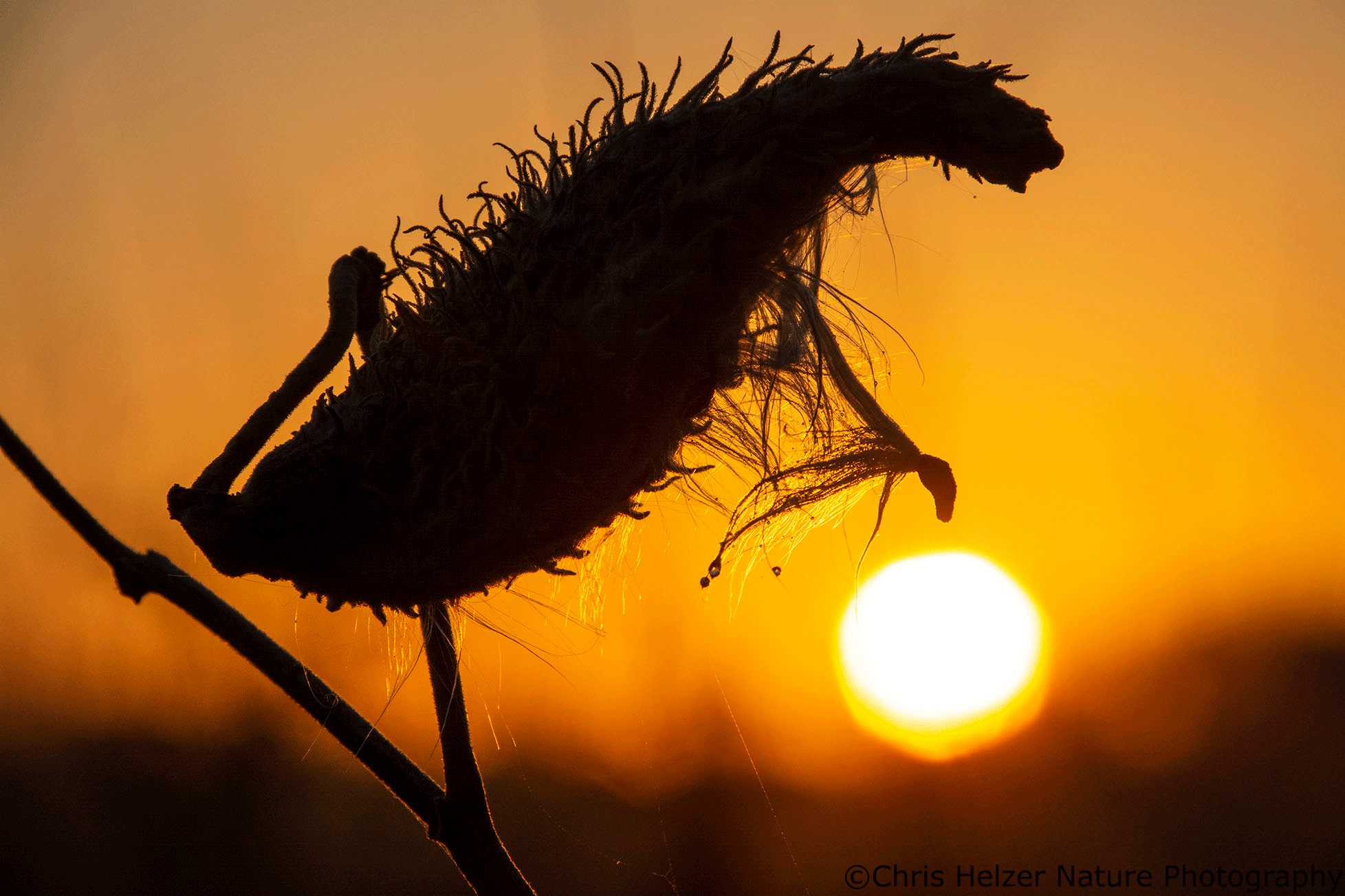 Common milkweed (Asclepias syriaca) pod and seed at sunrise. Nikon 18-300mm lens @300mm. ISO 320, f/14, 1/500 sec.Tall thistle (Cirsium altissimum) at sunrise. Nikon 18-300mm lens @300mm. ISO 320, f/14, 1/500 sec.Switchgrass (Panicum virgatum) at sunrise. Nikon 18-300mm lens @300mm. ISO 320, f/9, 1/1000 sec.Stinkbug on Canada goldenrod (Solidago canadensis). Nikon 105mm macro lens. ISO 500, f/10, 1/100 sec.Fly and morning dew. Nikon 105mm macro lens and Raynox 250 magnifier. ISO 500, f/16, 1/60 sec.
