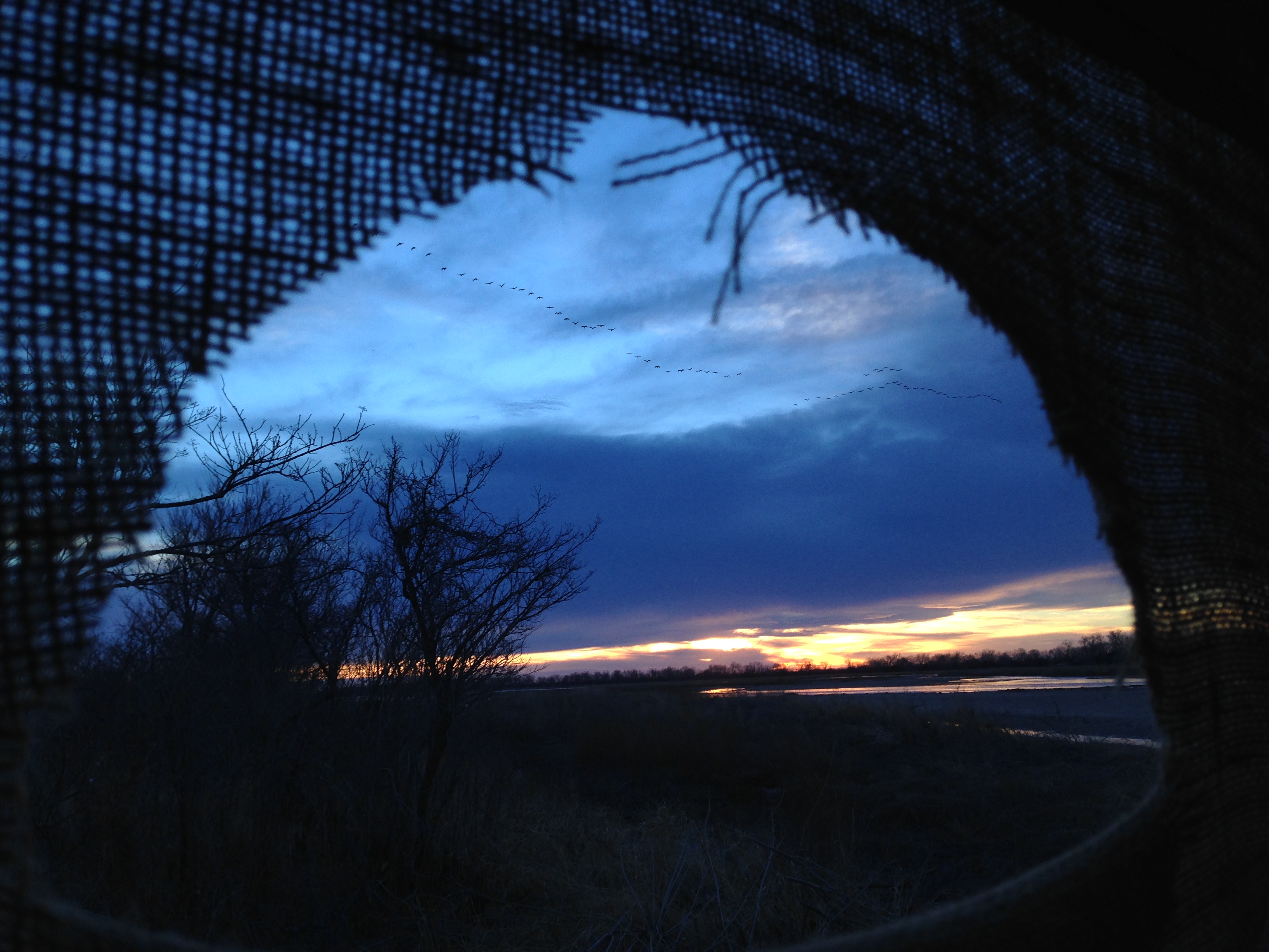 The night before last the cranes roosted directly downriver of our large blind. At first, we weren’t sure we’d get to see any of these birds up close. Whirlpools of birds circled and landed below the western horizon, their skinny long legs stretched out in front of them. They flew low overhead, but they didn’t seem to find what they were looking for in a roost on our part of the river. A lonely Canada goose stuck her neck straight up and honked at the sky, trying in vain to call down companions.