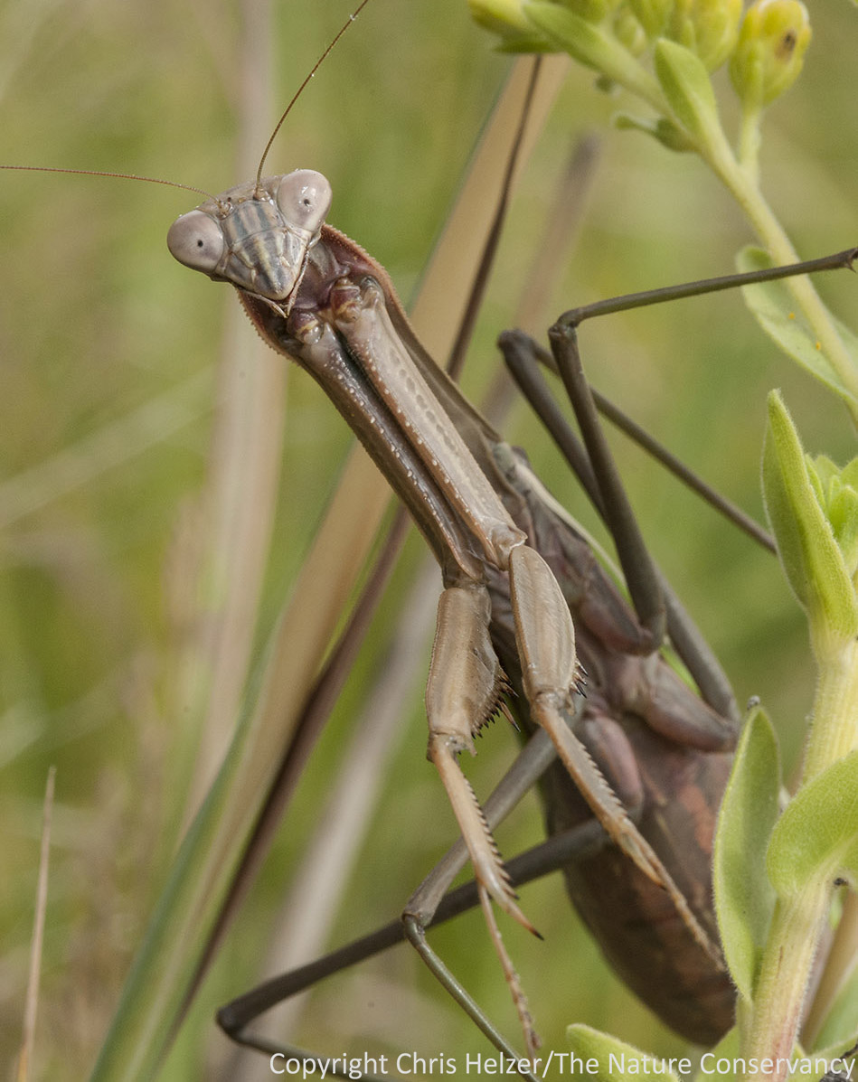 I went back to the same prairie in early September and photographed a big mantid feeding on a sphinx moth (A Fuzzy Meal) and saw a few more mantids nearby. Then, last weekend, I took another short walk in that prairie and saw about a dozen mantids within 15 minutes. What is going on?? Are other people seeing this many around this year?