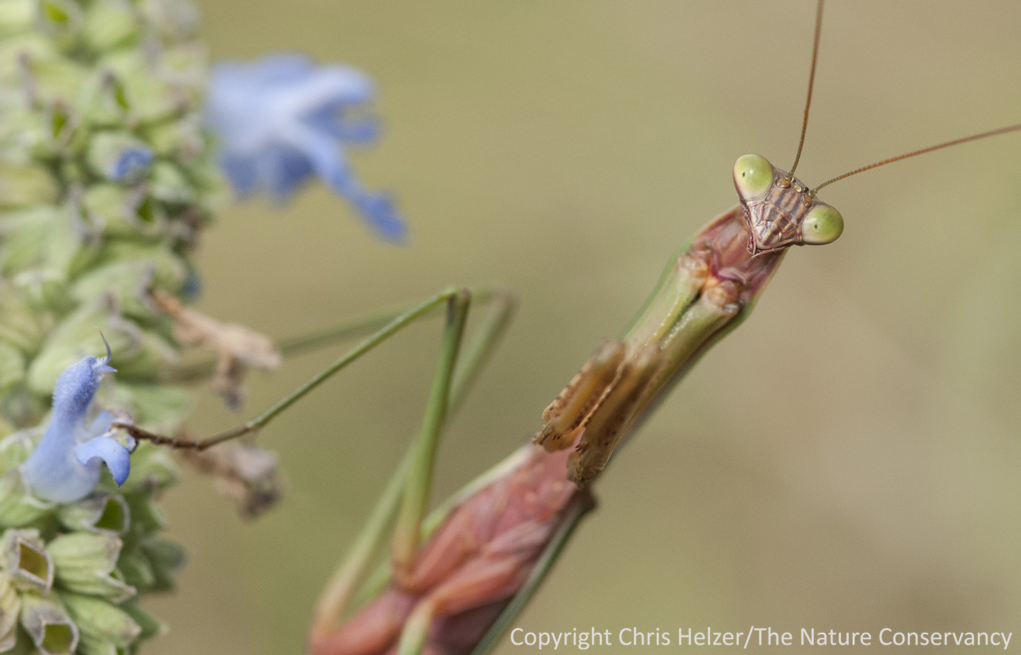 Interestingly, I found another praying mantis eating a sphinx moth on my walk last weekend. I wouldn’t have guessed that sphinx moths were a favorite food of mantids – or one that’s particularly easy to catch. On the other hand, I also noticed that most of the mantids I saw were sitting on or just beneath the flowers of pitcher sage (Salvia azurea) plants – just as the one in the last photo above is. It’s likely more than a mere coincidence that most of the sphinx moths I’ve seen flying in that prairie were feeding on pitcher sage… Wouldn’t you love to see that predation event in person?