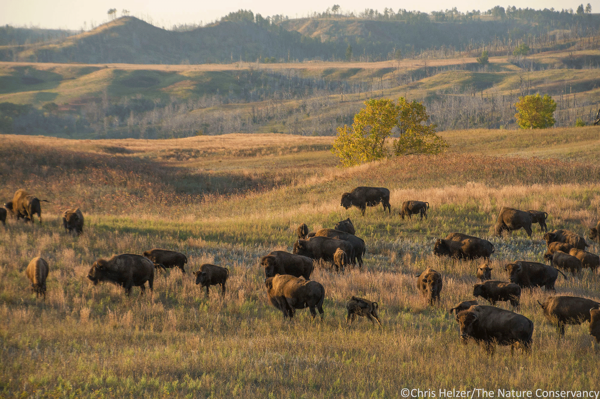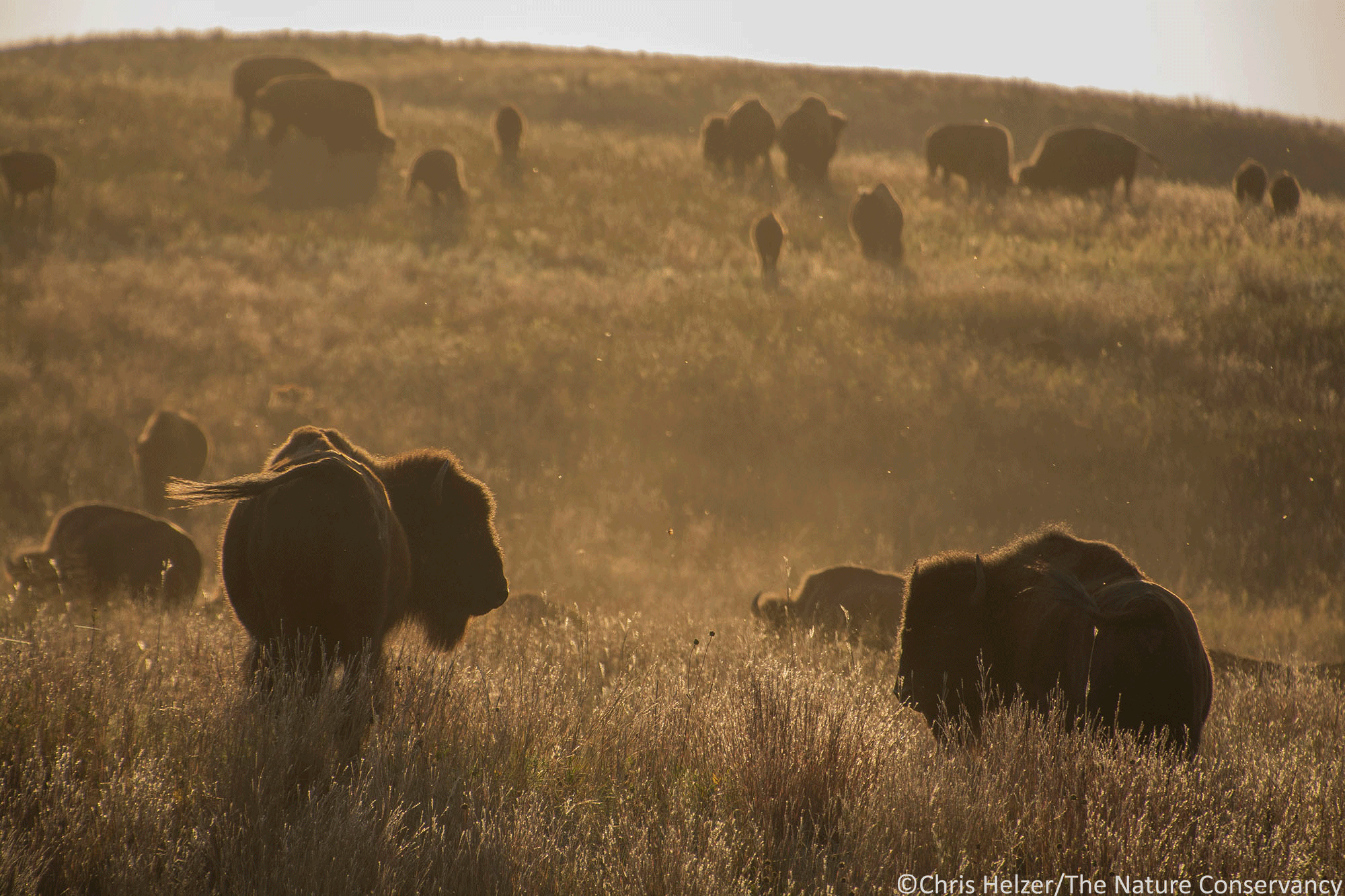 Yesterday, some of our Nebraska staff took a trip up to The Nature Conservancy’s Broken Kettle Grasslands in the northern Loess Hills of Iowa. Land steward James Baker led us on a very scenic hike before a band of cold rainy weather moved in. We then piled into some trucks with James and Director of Stewardship Scott Moats and went to visit the resident bison herd. The bison were peacefully grazing as we drove up, despite the pouring rain. When we stopped, a small group came over to check us out. Here are a few photos of those rugged bison, who didn’t need to huddle in dry and heated pickups to stay comfortable.