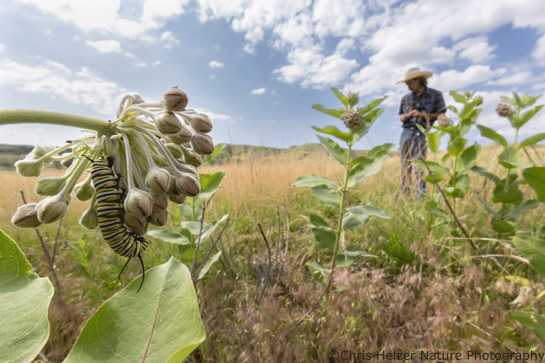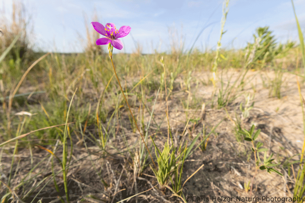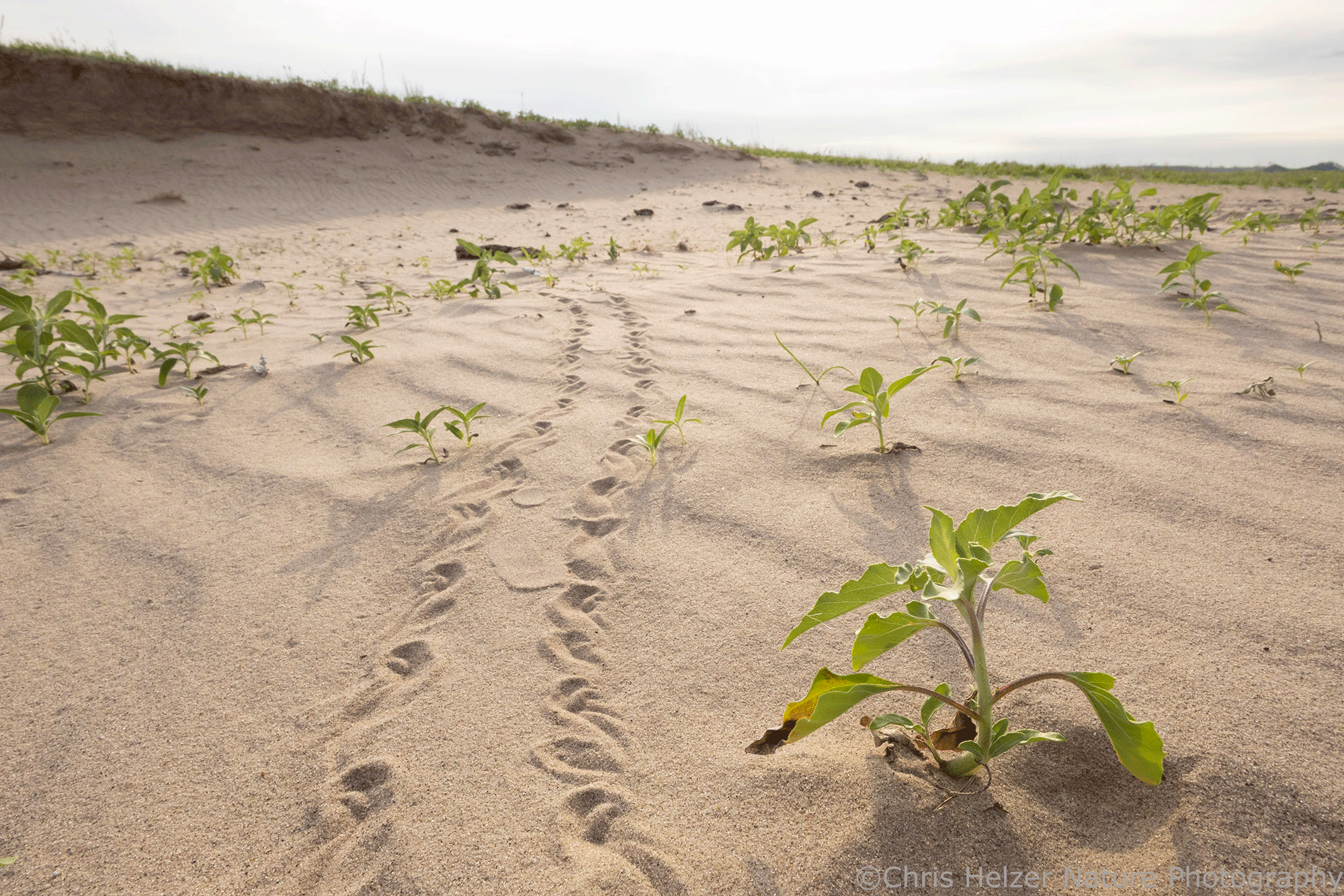 Prairie wild rose, bird tracks, and sandy prairie.Bull bison on recently-burned prairie.Lark sparrow with captured grasshopper.Ornate box turtle tracks in the sand.Monarch caterpillar on common milkweed with NVP Stewardship Manager Carson Schultz.Prairie fame-flower (Phemeranthus parviflorus).Stiff greenthread (Thelesperma filifolium).Longhorn beetle on upright prairie coneflower (Ratibida columnifera).