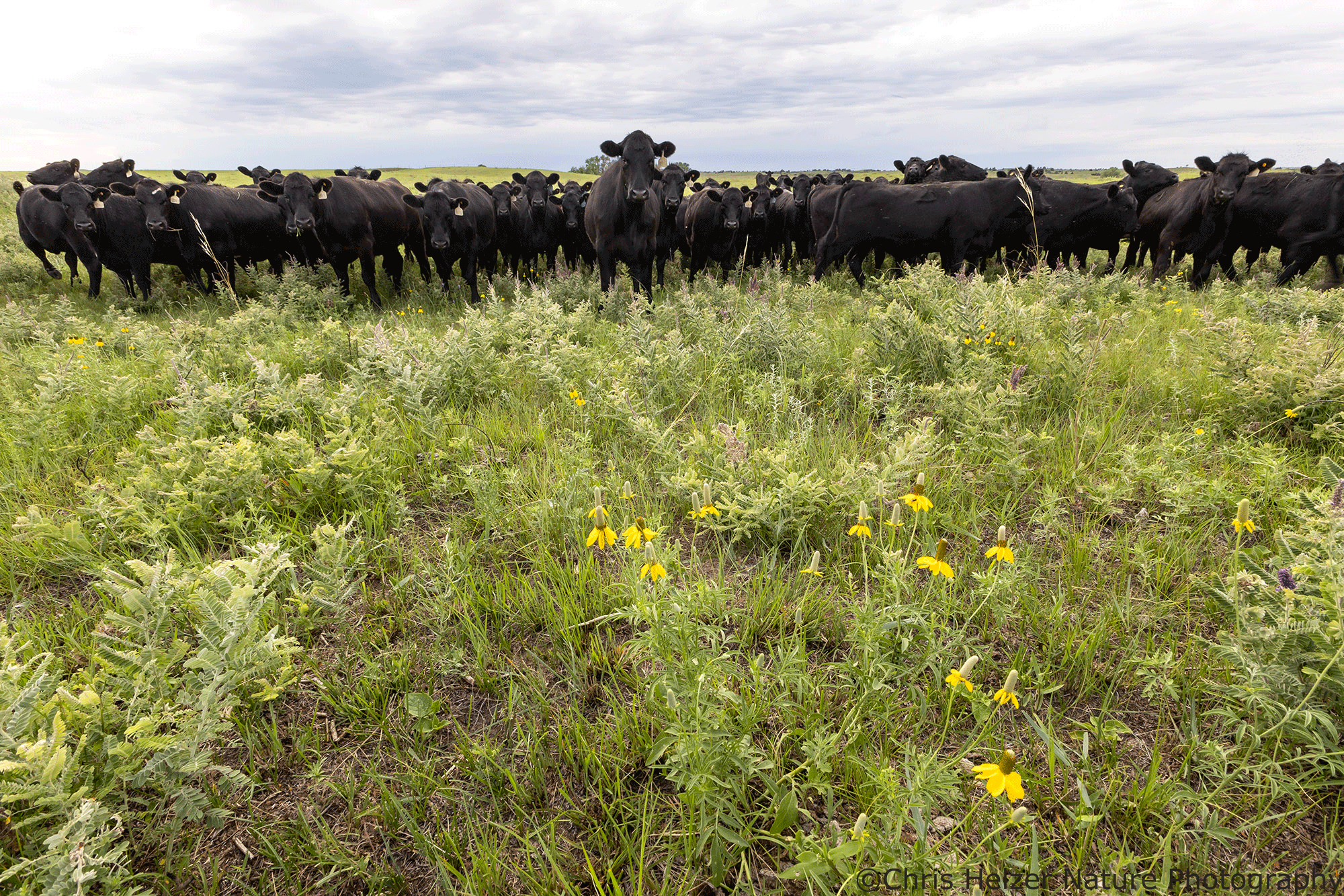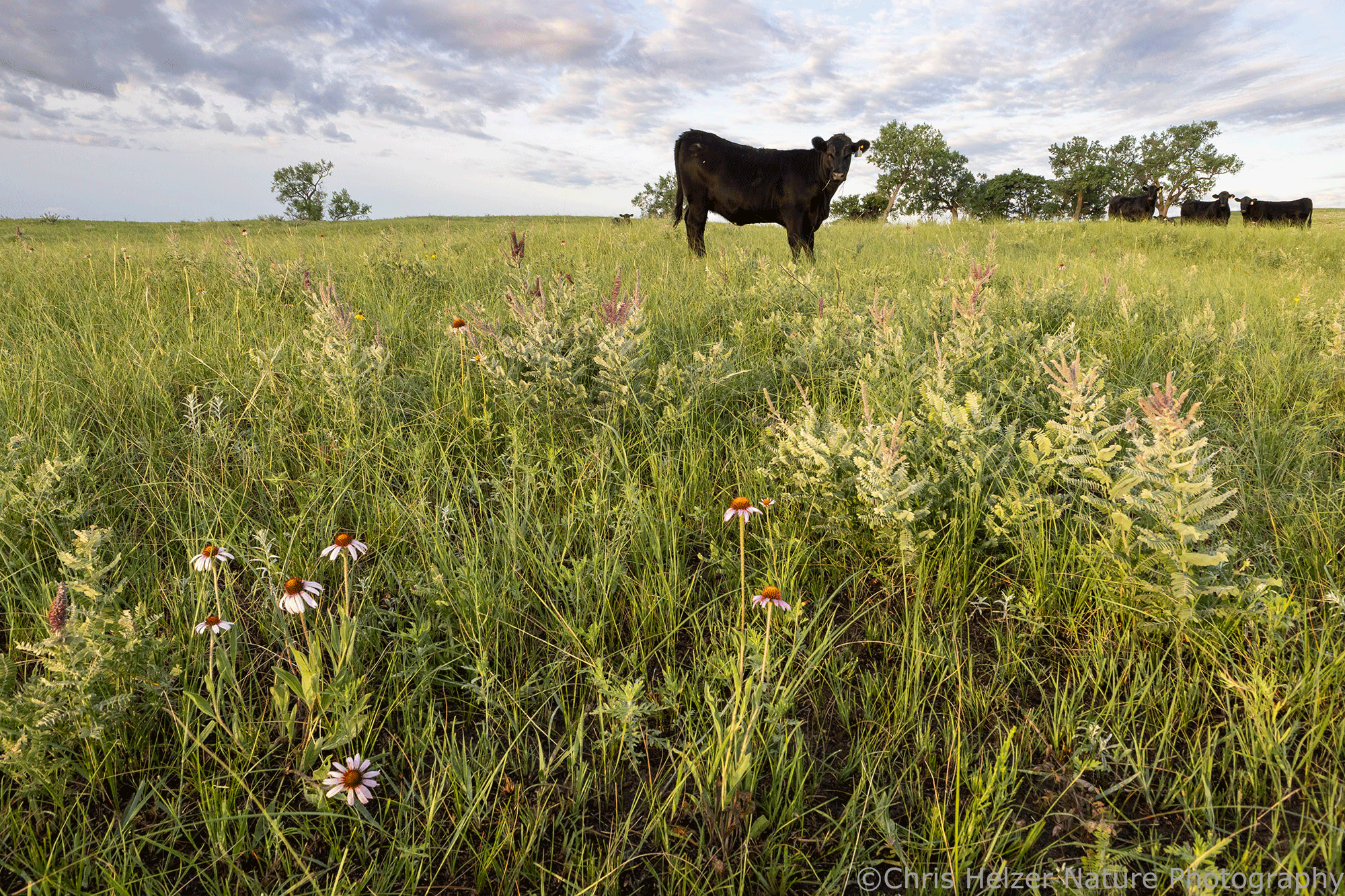 In the pasture I explored, the prairie had been burned in the spring and cattle entered in mid-May. They’d been grazing for over a month and had kept the grasses in the burned area pretty short. Their selective grazing, though, meant there was a lot of variety in the height of the vegetation, which created great wildlife habitat, as well as a fun place to photograph. In the unburned portion of the same pasture, the grasses were much taller and very little grazing was taking place. As a whole, then, the pasture provided a good mix of habitat structure and lots of blooming plants.