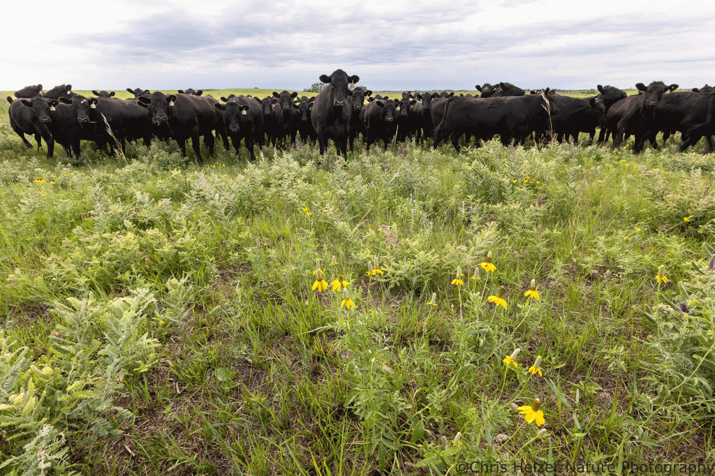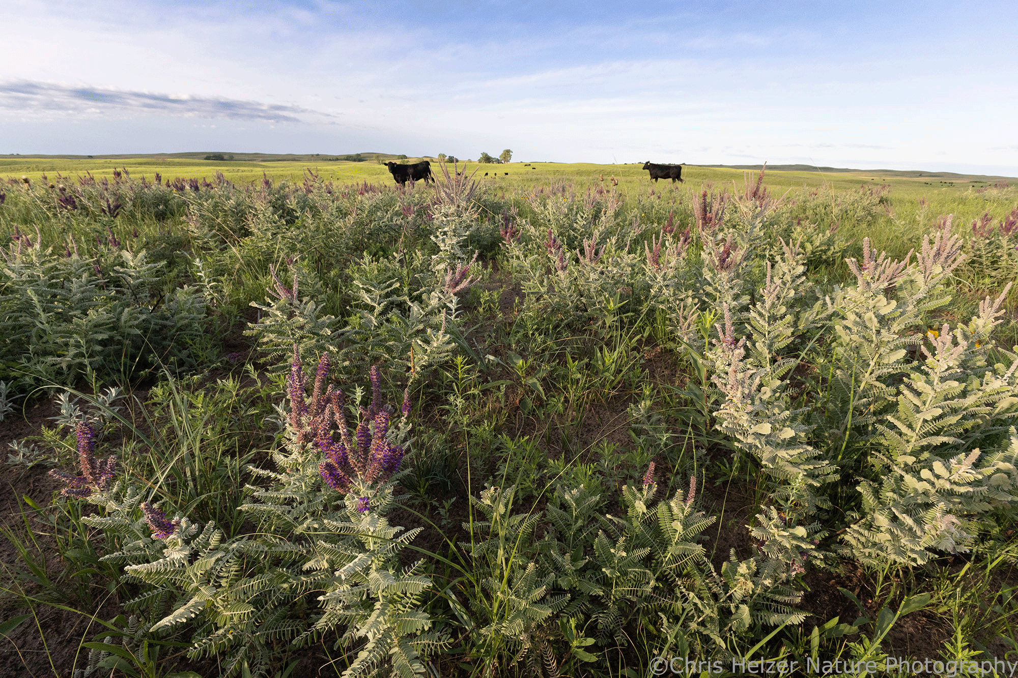 Cattle grazing with purple coneflower (Echinacea angustifolia) and lead plant (Amorpha canescens).Abundant lead plant with cattle.