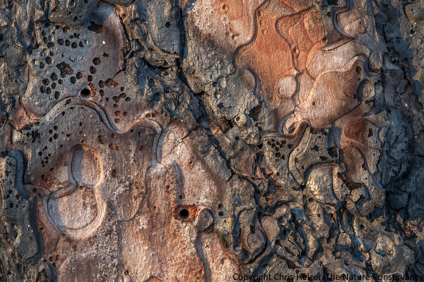 On my last trip to the Niobrara Valley Preserve, I photographed the bark of wildfire-killed pine trees in warm late day light.  I liked both the patterns and the color and was just trying to make some visually-interesting images.  As I was taking the photos, I saw numerous small holes in the trees but didn’t think much about them.  Holes in dead trees are not really unusual, after all.  Upon looking at the photos later, however, I noticed something intriguing – many of the holes seemed to have a funnel shape, or beveled edge, at the surface of the tree.