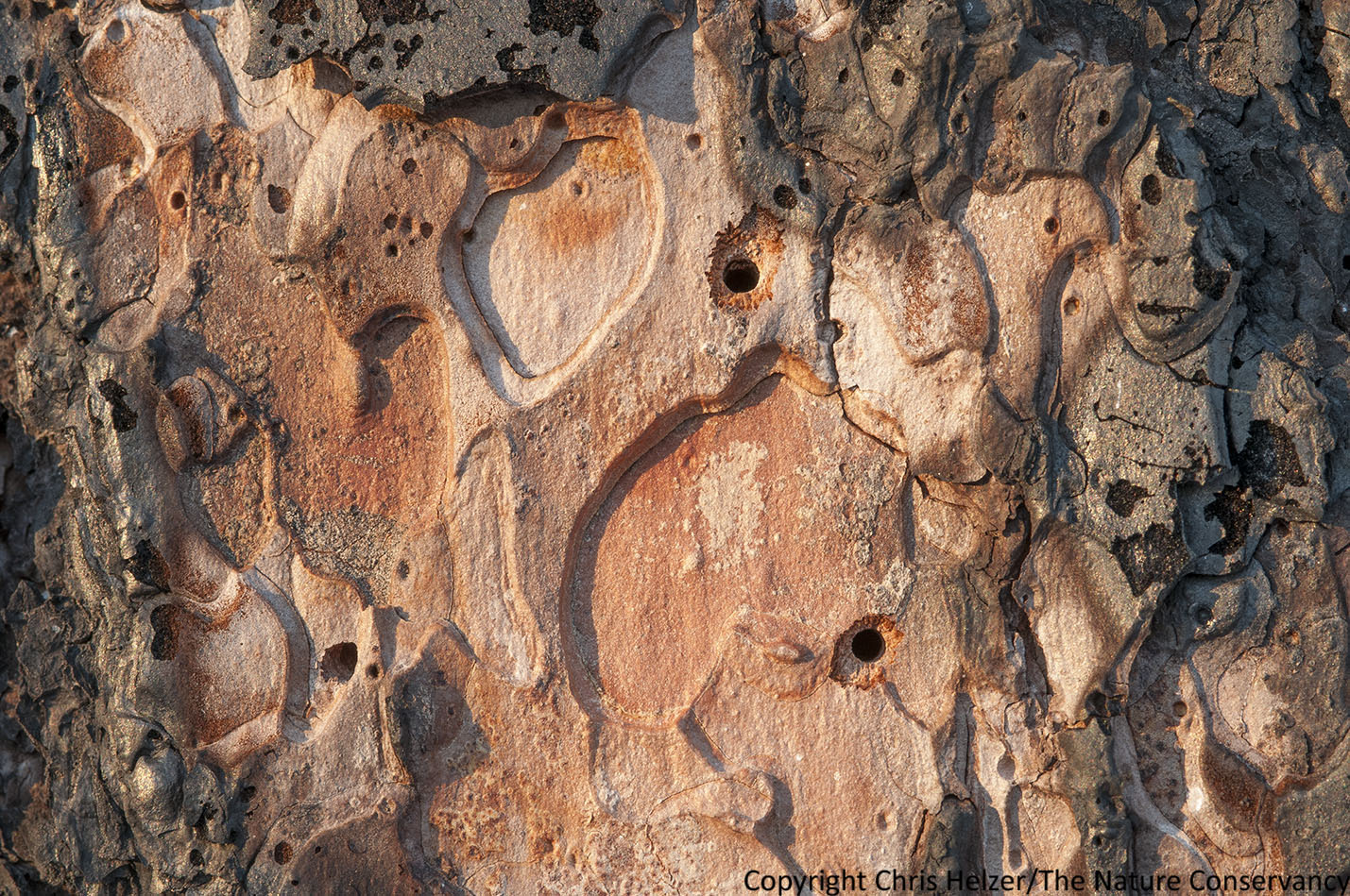 Tiny holes in the bark of a standing dead ponderosa pine tree killed by a 2012 wildfire.  The two near the center of the image have a funnel-shaped or beveled edge to them.  The Nature Conservancy’s Niobrara Valley Preserve, Nebraska.