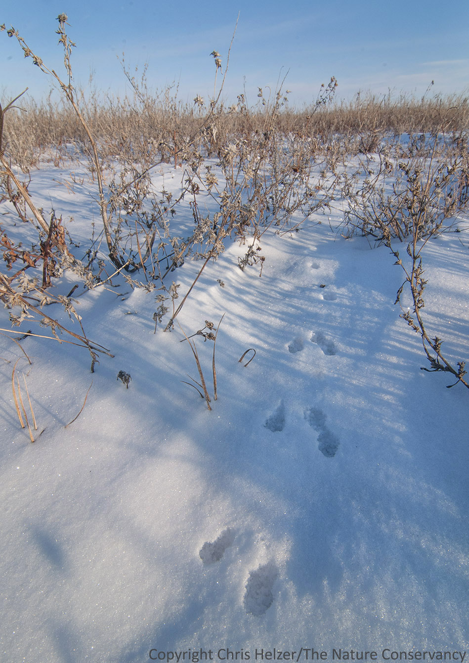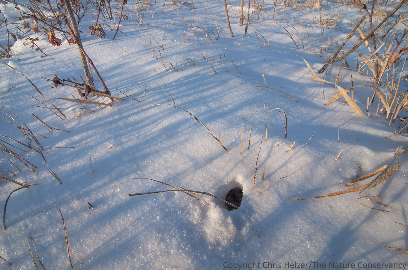 A hole in the snow gives away the location of a mouse den. Springer Basin Waterfowl Production Area – west of Aurora, Nebraska.