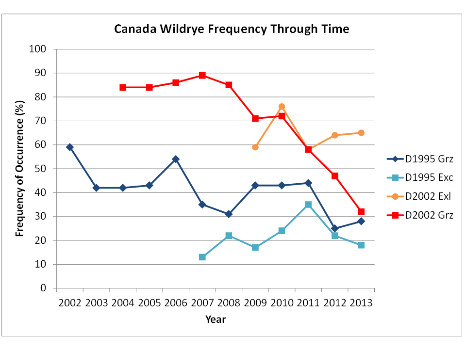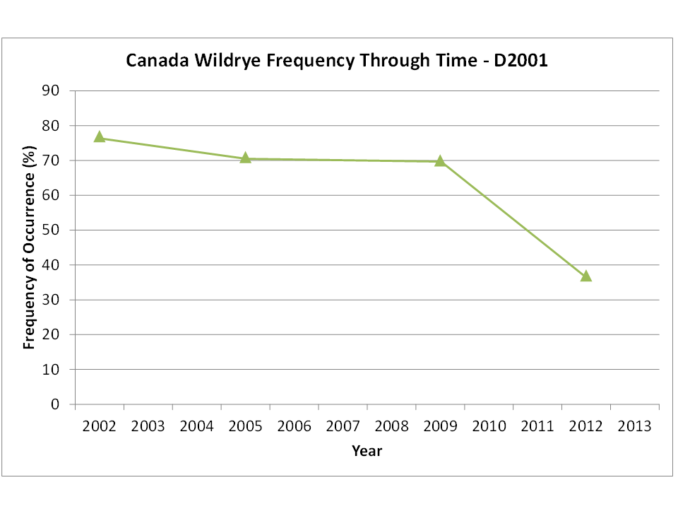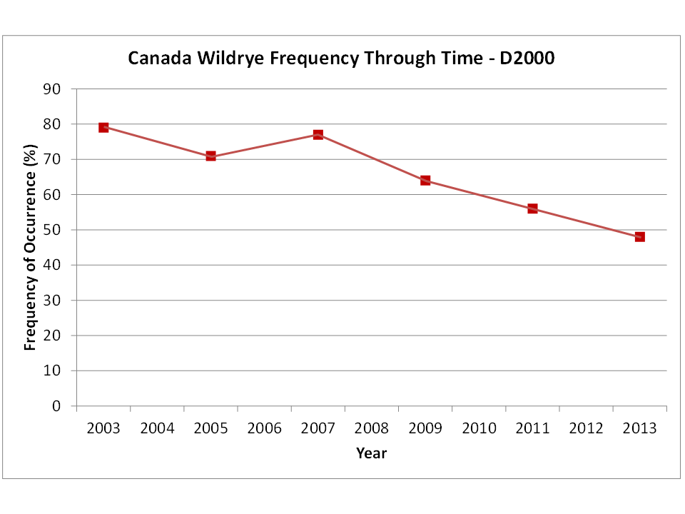 Both Kentucky bluegrass and smooth brome have increased in percent frequency over time. However, as in the 1995 planting, I’m not seeing any negative impacts on species diversity (yet?).