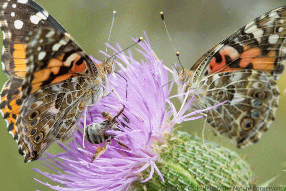 This painted lady butterfly was sharing this (native) tall thistle (Cirsium altissimum) blossom with a bee. Lincoln Creek Prairie, Aurora, Nebraska.