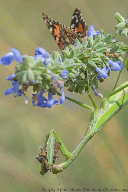 Danger lurks as a painted lady feeds right above a Chinese praying mantis which was finishing off a smaller butterfly (a skipper of some kind) this weekend.