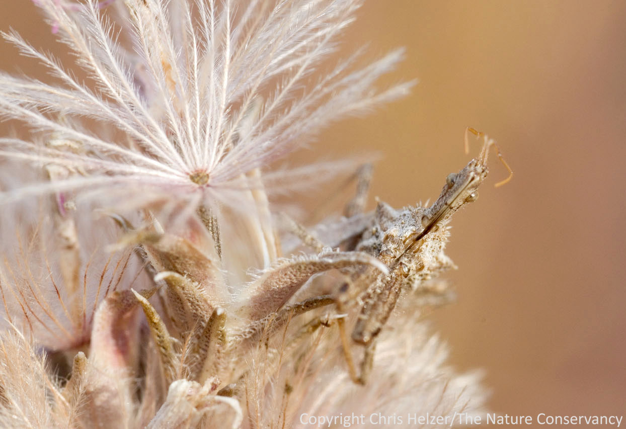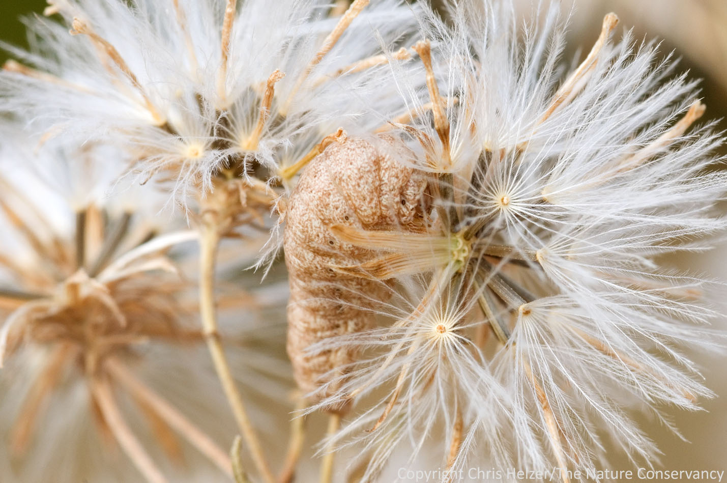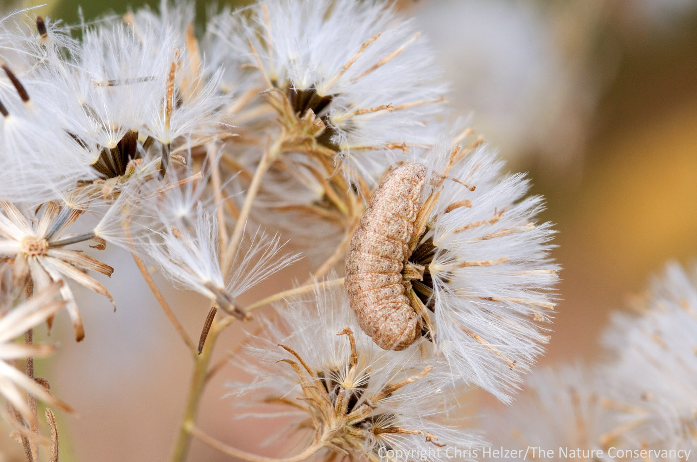 However, the prairie was not completely devoid of insects. As I was photographing seed heads of false boneset (Brickellia eupatorioides), I noticed that one of the flower stems seemed much thicker than it should have been. Upon closer inspection, it turned out to be a caterpillar. Anyone know what kind it is? I certainly don’t.